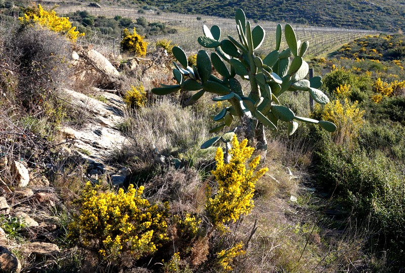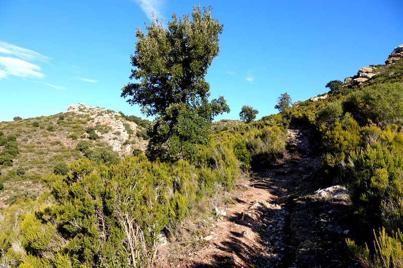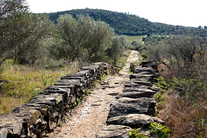 Là, deux options s’offrent à nous : suivre la piste qui traverse le plateau sans savoir où elle nous mènera – en réalité, elle rejoint la route de Montjoi dans un sens, et celle de Cadaquès dans l’autre – ou revenir sur nos pas pour reprendre le fil de la balade. Comme on n’a toujours pas vu les menhirs annoncés, on opte pour la seconde solution. On redescend donc jusqu’à la fourche, et là, on suit un très bel itinéraire qui serpente entre murets de pierre sèche, chênes lièges et végétation basse.