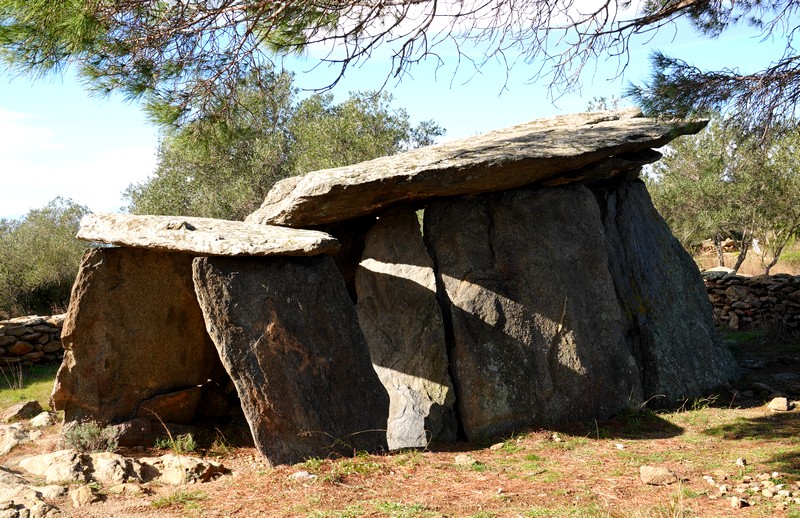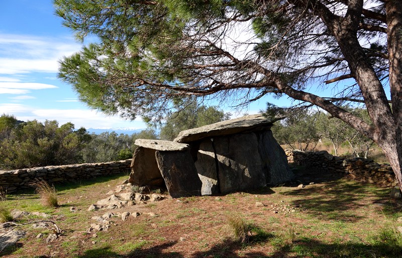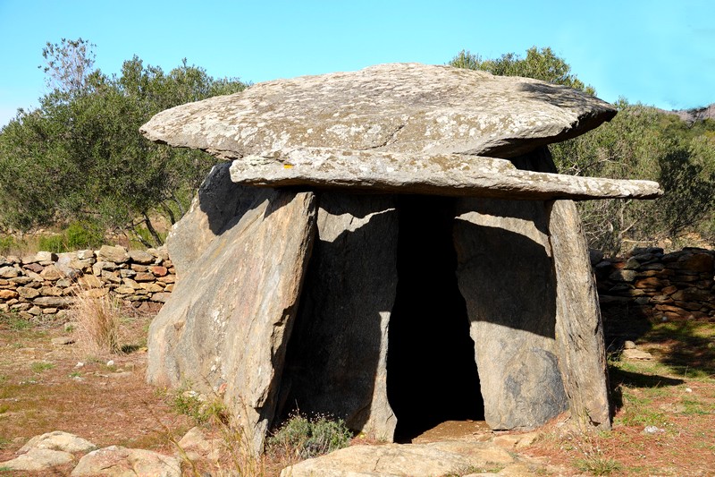 Alors que l’on se rapproche de l’endroit où on a posé nos vélos, on s’interroge : mais où se cache le fameux Dolmen de la Creu d’en Cobertella, clou de notre rando ? Le fléchage, très discret, nous fait un moment tourner en rond car nous pensions le monument plus haut dans la montagne. Finalement, il ne se trouve qu’à quelques centaines de mètres du parking ! Considéré comme le plus important de Catalogne par ses dimensions, le dolmen – vieux de plus de 5000 ans et autrefois employé comme sépulture à couloir – a été répertorié pour la première fois en 1912, après avoir été utilisé des années comme basse-cour d’une ferme ! Vu son passif fermier, on est très impressionnés par son remarquable état de conservation, et on passe un bon moment à l’observer sous toutes ses faces…