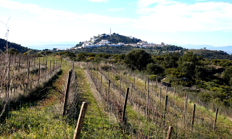 Aujourd’hui, on profite d’une belle météo – vent en berne et beau soleil ! – pour parfaire notre découverte du patrimoine naturel et culturel de Roses. Au programme : le sentier de randonnée qui parcourt la sierra et passe par la zone mégalithique de la Casa Cremada. Eh oui, il n’y a pas qu’en Bretagne que l’on peut admirer dolmens et menhirs ! L’Empordà – la région où se situe Roses – compte également quelques beaux exemplaires, voire même les plus importants de la péninsule ibérique. Pour se rapprocher de l’attaque du chemin, on commence par enfourcher les vélos et on prend la direction de Montjoi. La route grimpe dans un joli vallon qui s’étire sur la face nord du Puig Rom et du Castrum Visigoth, nous offrant ainsi un autre angle sur les deux sites. Quatre kilomètres et 130m plus haut, nous attachons solidement nos montures, et attaquons la petite rando. Nous suivons l’itinéraire bleu turquoise – qui, bizarrement, est signalé en mauve sur la carte fournie par l’OT !