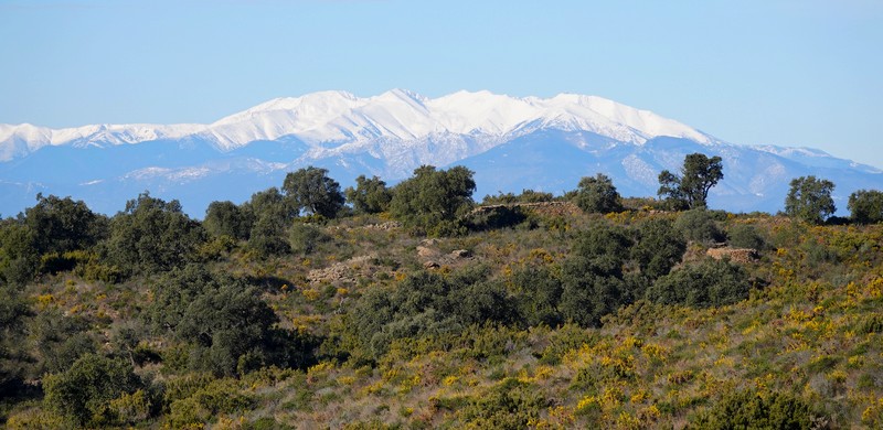 - Randonnée « Itinéraire Mégalithes et Pierre sèche« , n°6 mauve carte OT / bleu turquoise sur place, 5km, 250m+, 2h (avec le détour jusqu’au promontoire sur Montjoi), facile. On conseille d’effectuer la boucle dans le sens anti-horaire, car ainsi, on garde le meilleur – le dolmen – pour la fin ! Dans ce cas, l’attaque est à 50m vers l’est, au-dessus du second petit parking. Attention, fléchage assez discret. Accès au départ du sentier à vélo, 8km AR, 130m+. Pour ceux qui viendraient en voiture, il faut savoir qu’il y a très peu de places disponibles pour se garer.