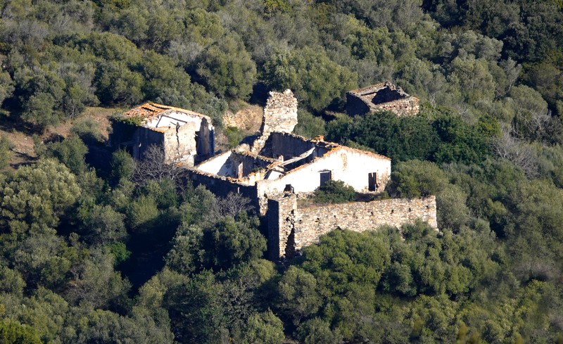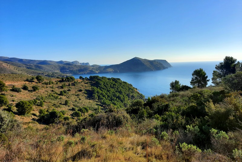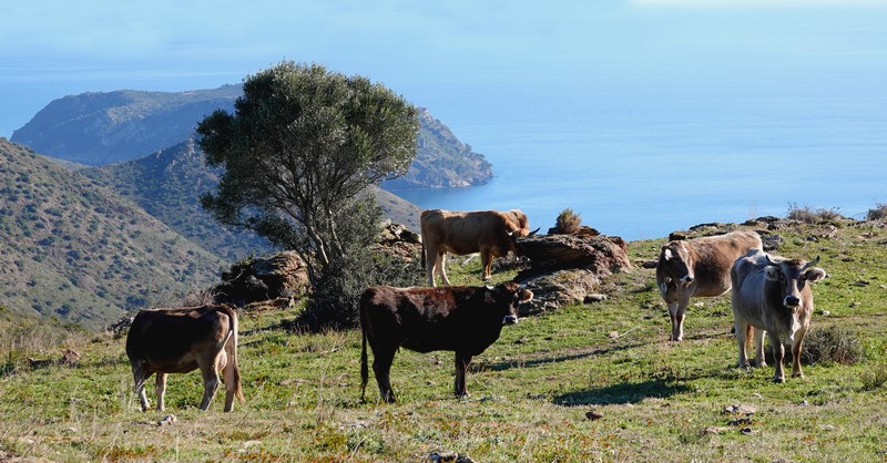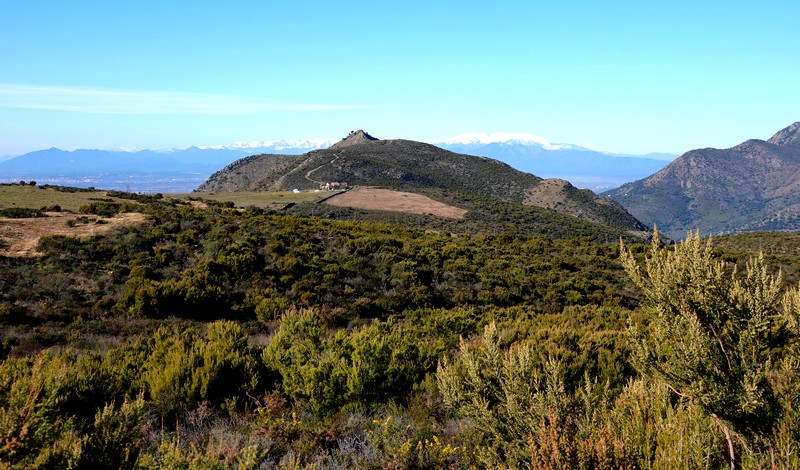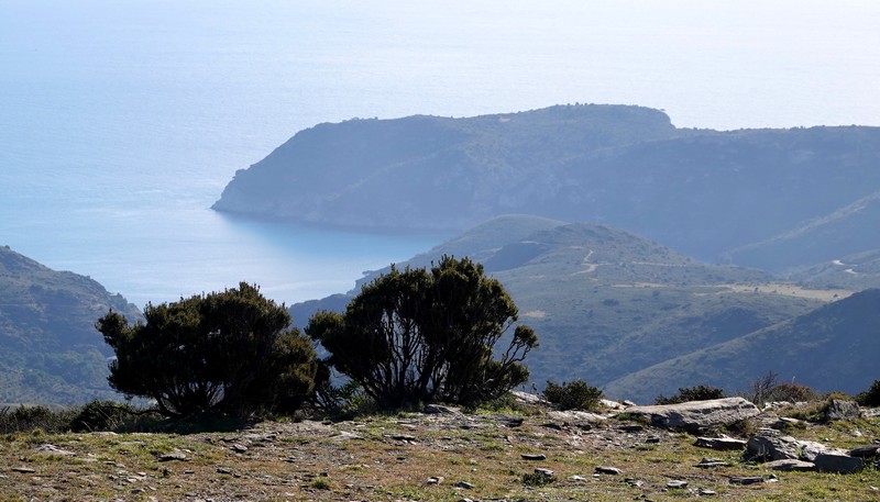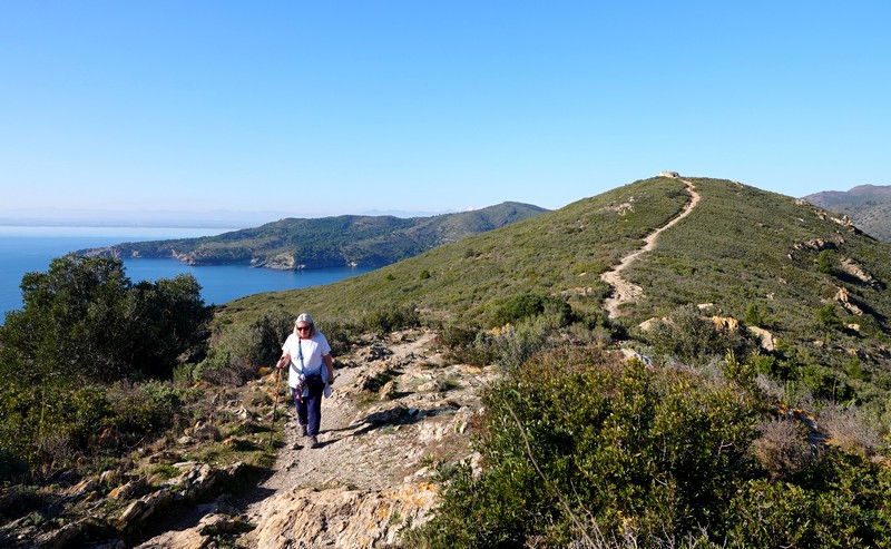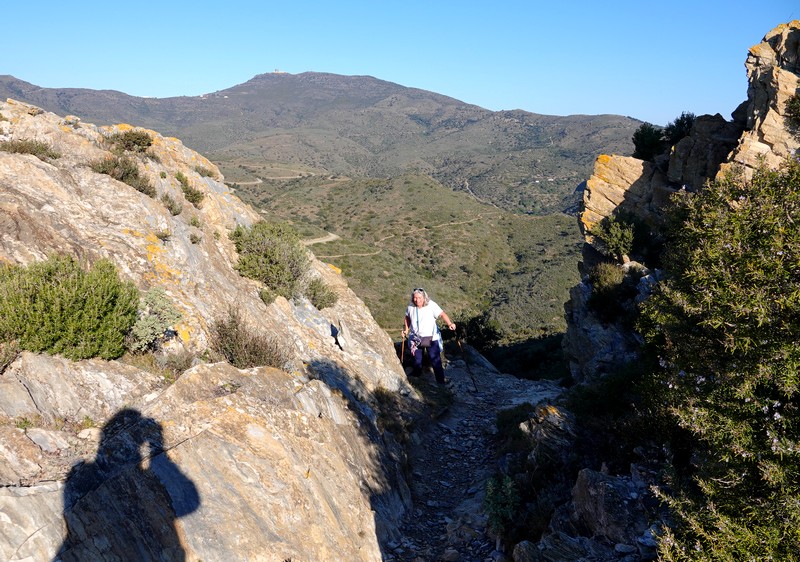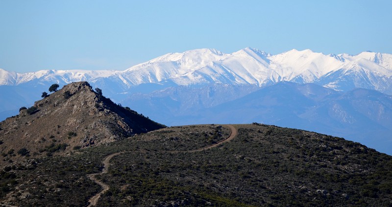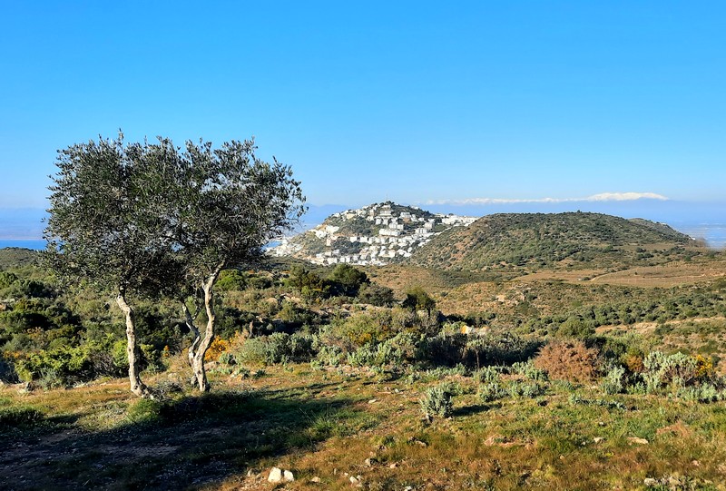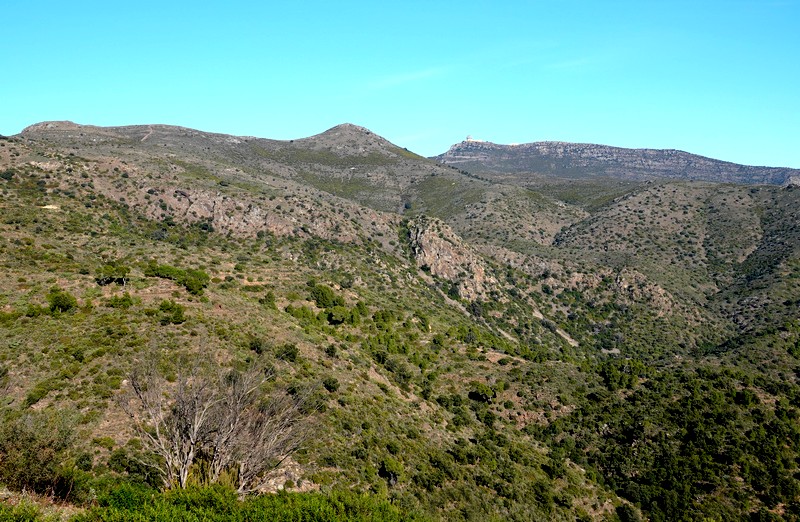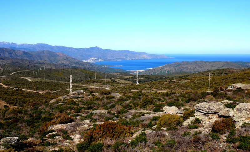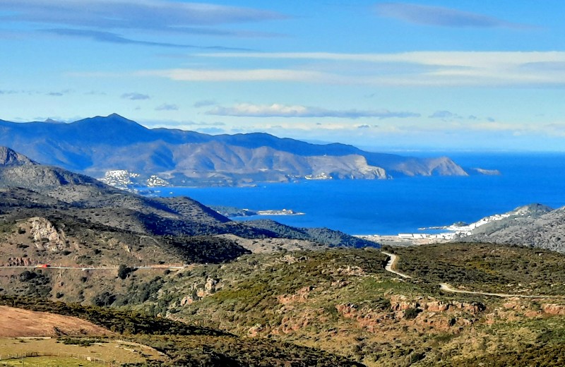 Une fois Gérard arrivé, on suit une petite portion encore goudronnée, puis on emprunte la piste qui continue à s’élever dans la sierra. Au sommet, le paysage est saisissant, et le regard – vers le nord – porte presque jusqu’à la frontière française, avec une vue sur le Cap de Cervera de la Marenda, situé à deux pas de Cerbère. Et en contrebas, on aperçoit les façades blanches des maisons d’El Port de la Selva…