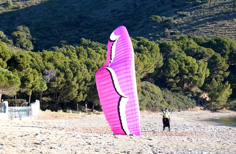 A Montjoi, après une belle descente cheveux au vent – et hop, 180m de dénivelé négatif avalés en quelques minutes – on fait un petite pause sur la plage occupée par quelques parapentistes qui viennent d’atterrir. Bizarrement, le sable gris caillouteux est moins chatoyant à l’œil – et au pied ! – qu’espéré…