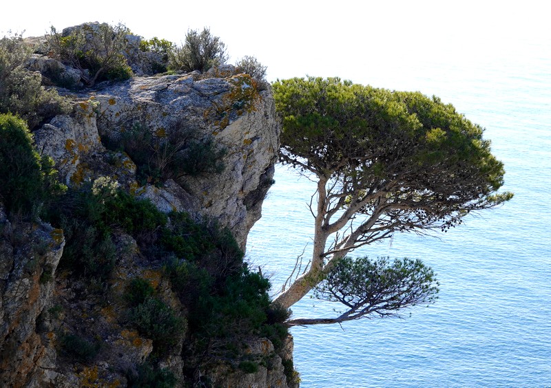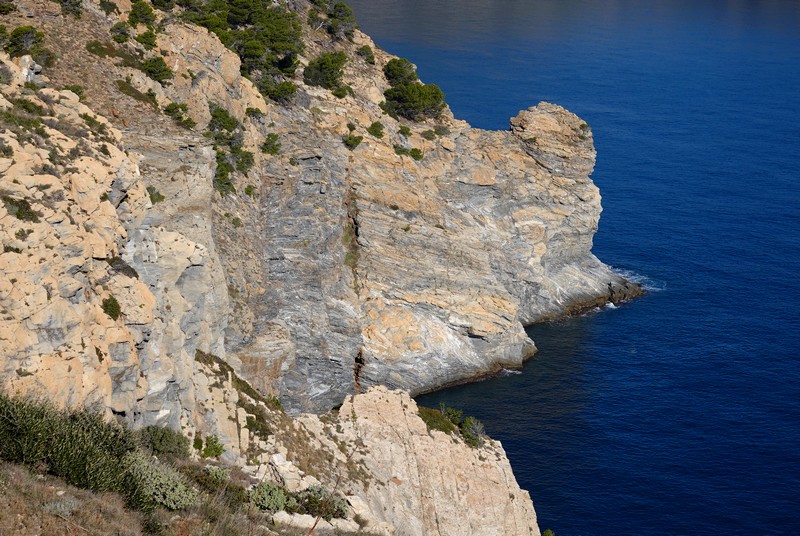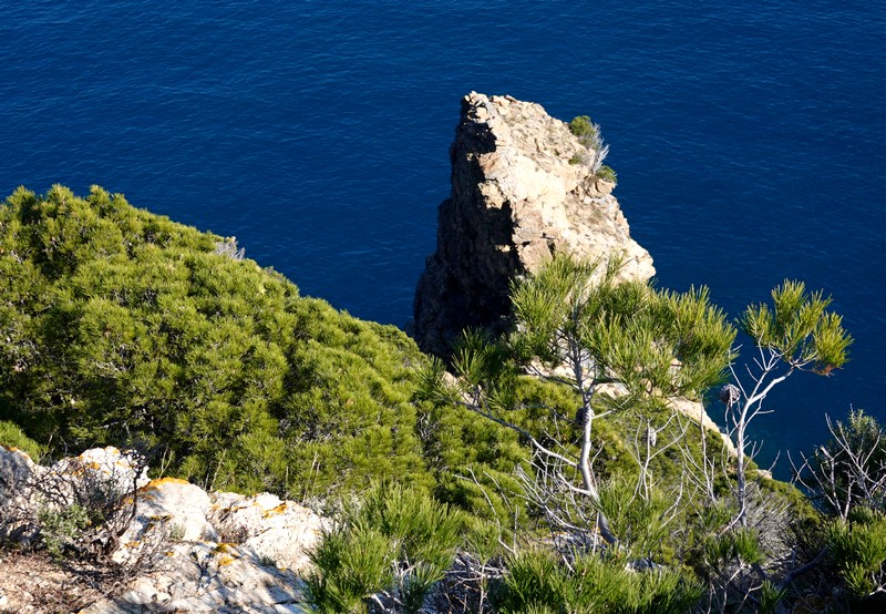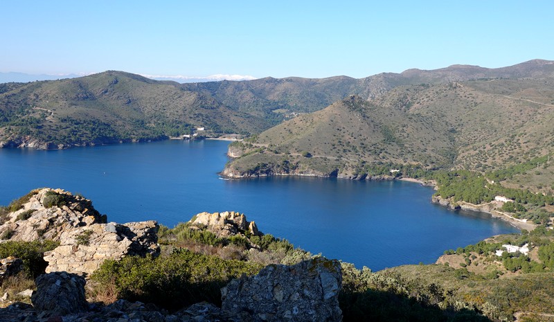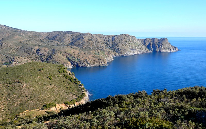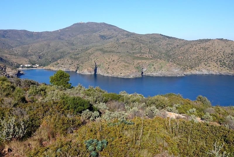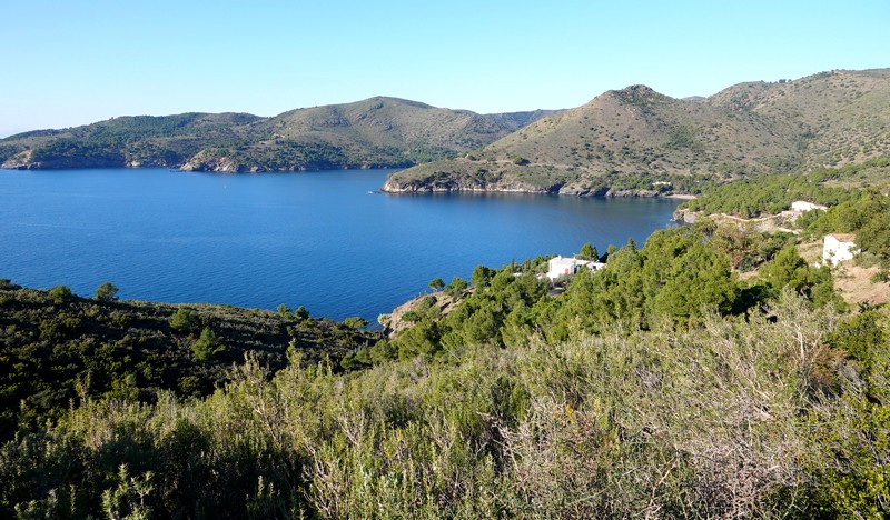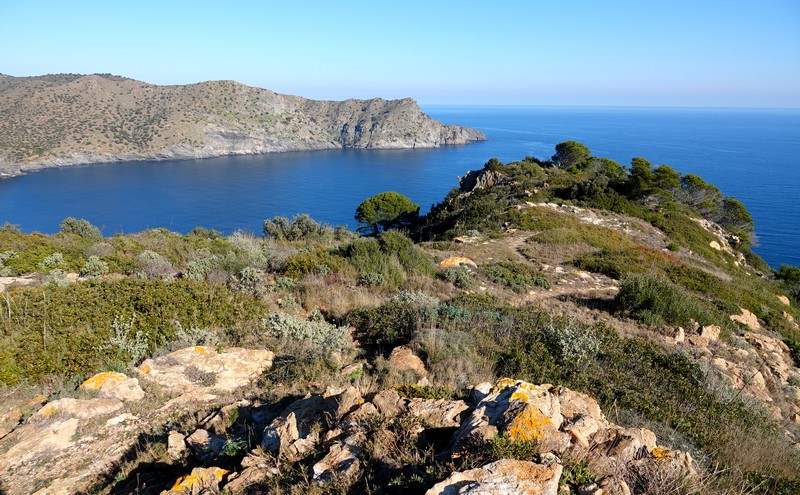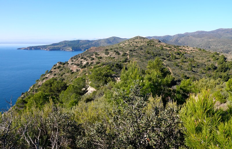 On repart, et cette fois, on bascule côté sud : maintenant, c’est le cap Norfeu et la cala Montjoi qui s’étalent à nos pied, 440m plus bas… Superbe !