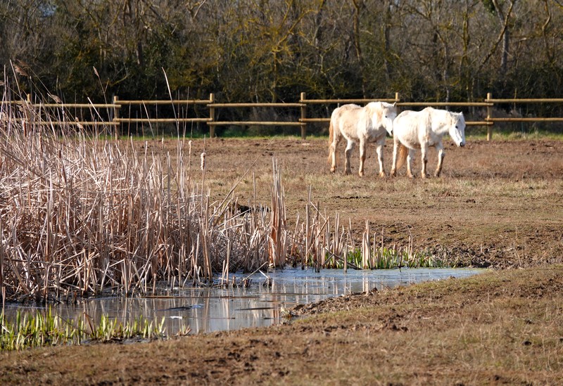 Là, on assiste à un règlement de compte, bref mais vigoureux, entre deux hérons. Manque de bol, des arbustes empêchent toute prise de vue nette. Néanmoins, cet observatoire donne sur un pré où s’ébattent des chevaux. En effet, la réserve et ses marécages sont entourés de zones agricoles et d’élevage – et même d’un camping !