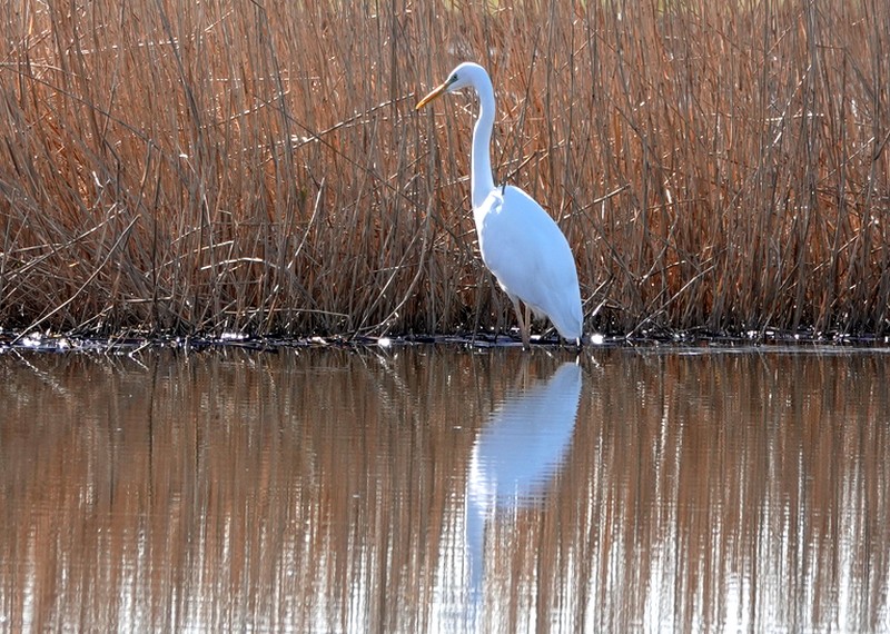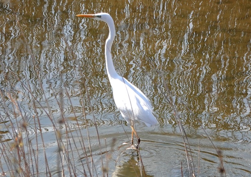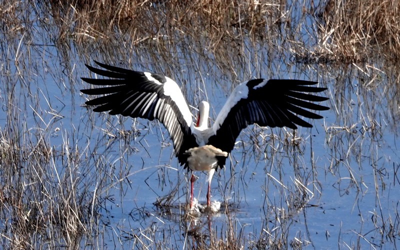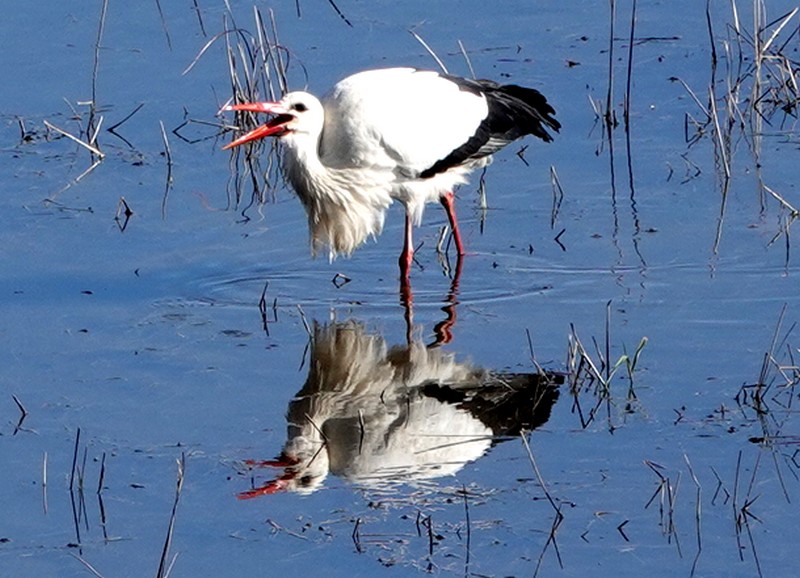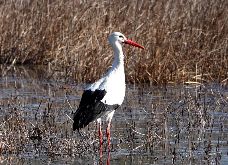 Après un bon moment passé à contempler l’horizon, on retourne au bord de l’étang pour une ultime observation. Il est 13h passés, et les oiseaux commencent à se faire rares. Seuls une grande aigrette, une cigogne et un beau vanneau huppé se nourrissent, pattes dans l’eau, sans se soucier de nous…