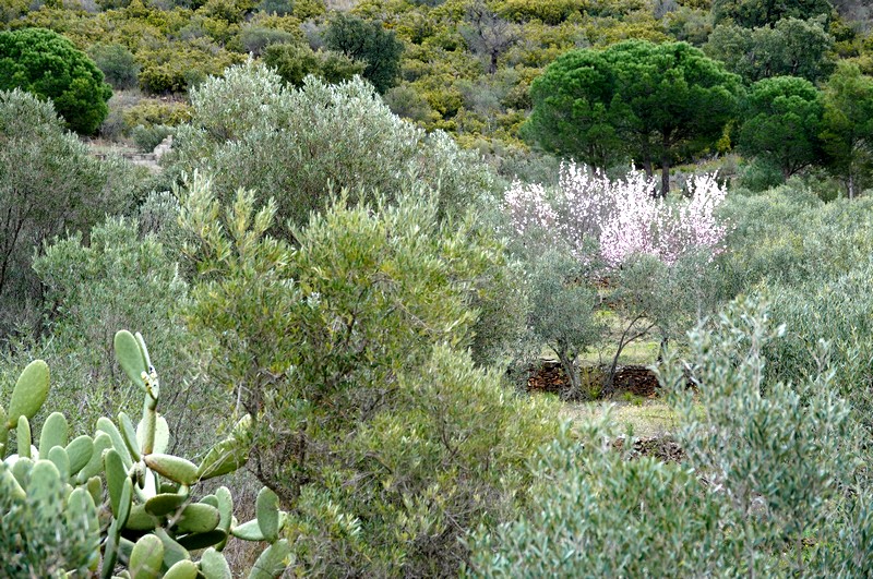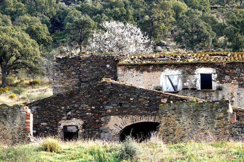 Assez rapidement on parvient aux ruines du Mas de l’Alzeda ; le site, référencé depuis 1362, abritait autrefois un moulin mais il n’en reste aucune trace. Toutefois, on remarque les terrasses encore présentes des anciennes cultures, et adossé à la maison, subsiste un bel amandier en fleur.