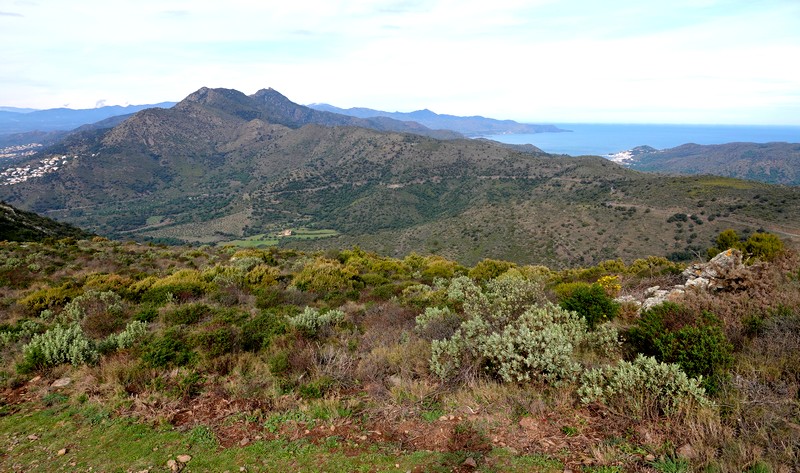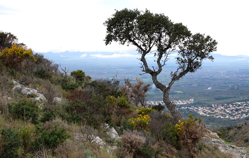 Après avoir franchi le Puig de la Sardina, on arrive enfin au but de la rando : le Puig de l’Aliga. Du haut de ses 463m, il domine toute la baie de Roses. Et la vue sur les environs – même sous ce ciel gris-blanc – est époustouflante, car au nord on distingue Port de la Selva et le cap Cerbère, et à l’ouest, on a le Puig Sant Salvatore au premier plan – et les ruines du château où nous sommes allés la semaine dernière – puis au loin, les Pyrénées. En revanche, on ne voit aucun aigle de Bonelli – hôte permanent des parages. Dommage ! On reviendra en mars, où là on aura peut-être la chance d’apercevoir le circaète Jean-le-Blanc, un rapace migrateur de grande taille qui reste dans la région jusqu’en septembre.