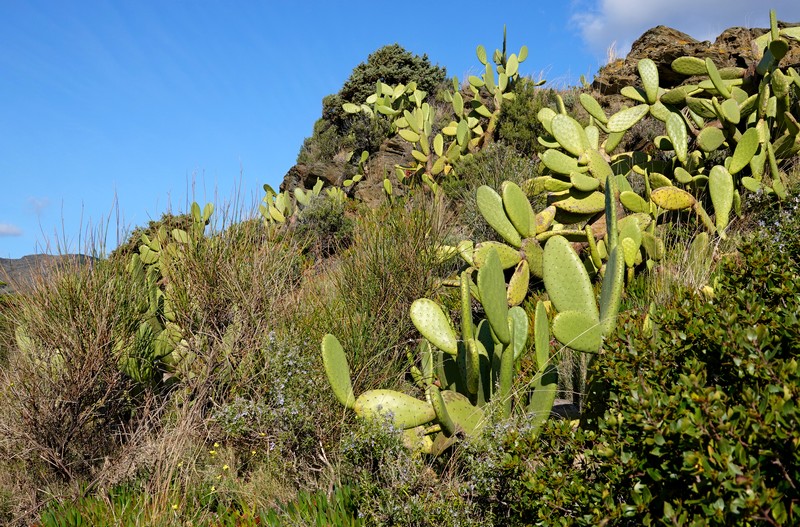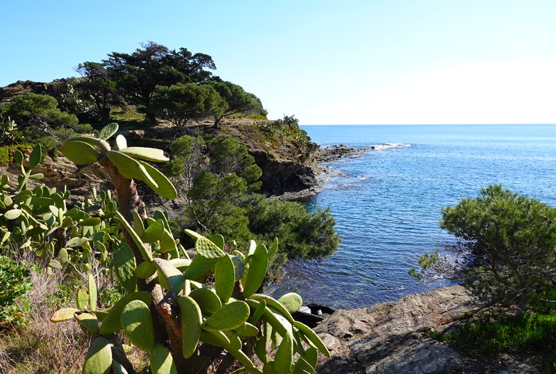 Le ciel affichant ce matin un bleu sans nuage, nous partons à vélo vers 9h15 et prenons sans attendre la direction de Cadaqués. Cela fait longtemps que nous souhaitions faire cette balade, mais nous attendions une météo idéale, et surtout une absence de vent. Sitôt sortis de Roses, le ton est donné : la route grimpe régulièrement, mais de manière assez soutenue jusqu’à la bifurcation vers la zone militaire. Pendant 5km, et sur 280m de dénivelé positif, nos mollets ne chôment pas – surtout ceux de Gérard qui monte avec un vélo SANS assistance électrique ! Comme nous avions déjà découvert cette portion de route lors d’une précédente balade, on ne traine pas. En revanche, dans la descente, on prend le temps d’effectuer plusieurs arrêts. Le paysage est superbe : côté mer, on commence à apercevoir les façades blanches des maisons qui font la renommée de Cadaqués, et côté montagne, on est cernés par les oliviers, les cactus et le mimosa en fleur. Magnifique !