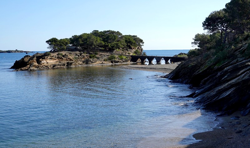 Cadaqués – Depuis le pont qui relie la petite ile ; en contrebas, la plage des Sortell