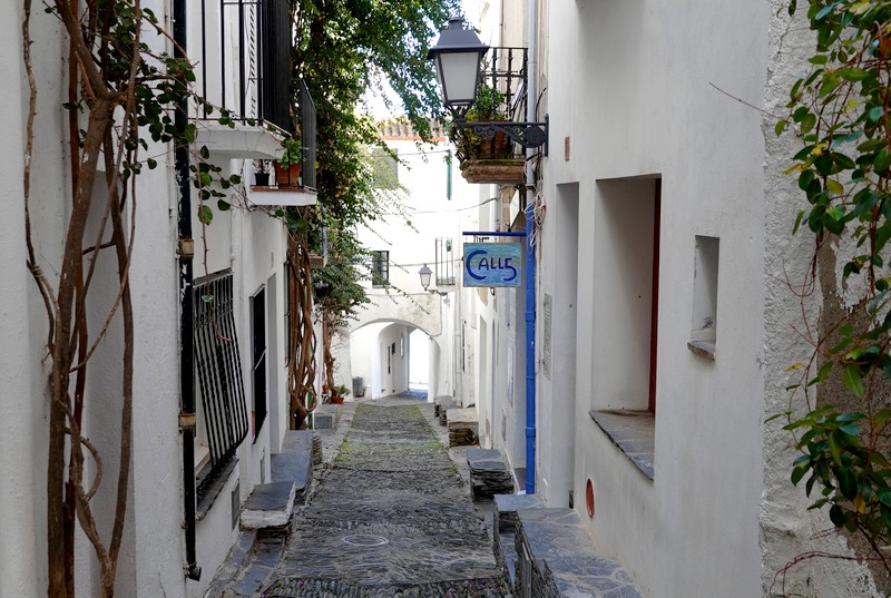 Puis, un peu au hasard, on s’enfonce dans les ruelles bien pentues de Cadaqués. On remarque que souvent, le sol est composé de morceaux de pierre d’ardoise placés en position verticale : c’est à la fois original, esthétique et malin, car cette forme d’épi est conçue pour absorber l’eau et rendre ainsi la chaussée peu glissante en cas de pluie.
