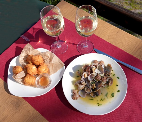 Cette petite balade au grand air nous ayant ouvert l’appétit, on redescend en bord de mer, et on s’installe sur la terrasse du restaurant Lo Sai. Celle-ci se remplit vite, il faut dire que bon nombre d’établissements sont encore en vacances d’hiver. On se régale en choisissant, à la carte, acras de morue, sardines grillées, palourdes à l’ail et succulents calamars grillés, le tout arrosé d’une bouteille de Sinols blanc de l’Emporda, un blanc local goûteux qui devrait favoriser notre remontée vers Roses !