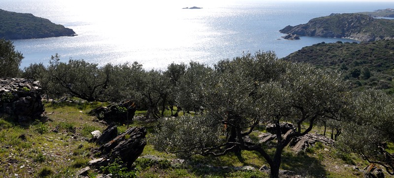 Après deux jours tranquilles, on repart de bon matin pour une rando pédestre au départ de Mas Oliva. Il s’agit d’une boucle de 7km pour 470m de dénivelé positif qui mène au Puig de l’Aliga, déjà réalisée début février et idéale pour se dégourdir les jambes sans avoir à courir loin de Roses. On repasse donc avec plaisir devant l’olivier multi-centenaire, puis on suit le sentier pierreux qui s’élève au-dessus du Mas de l’Alzeda.