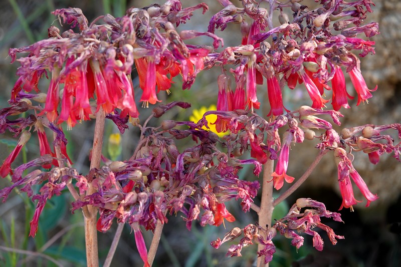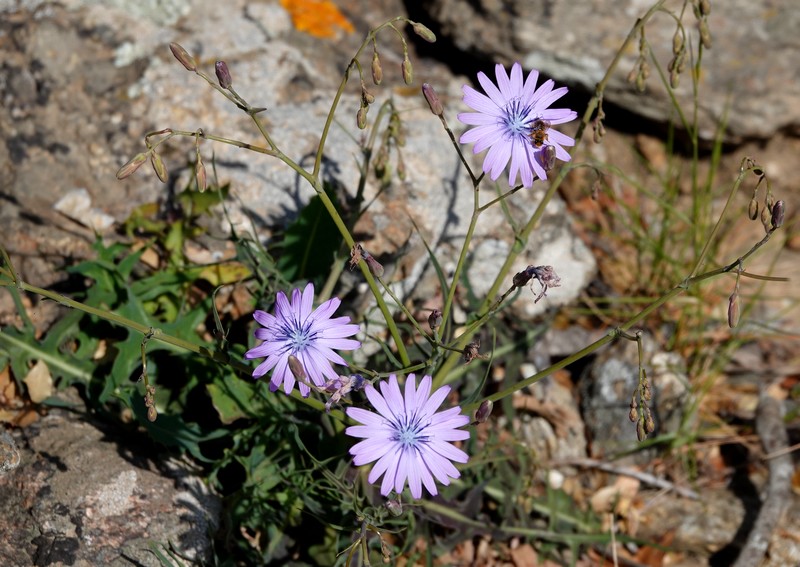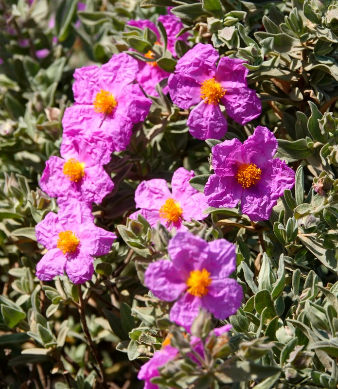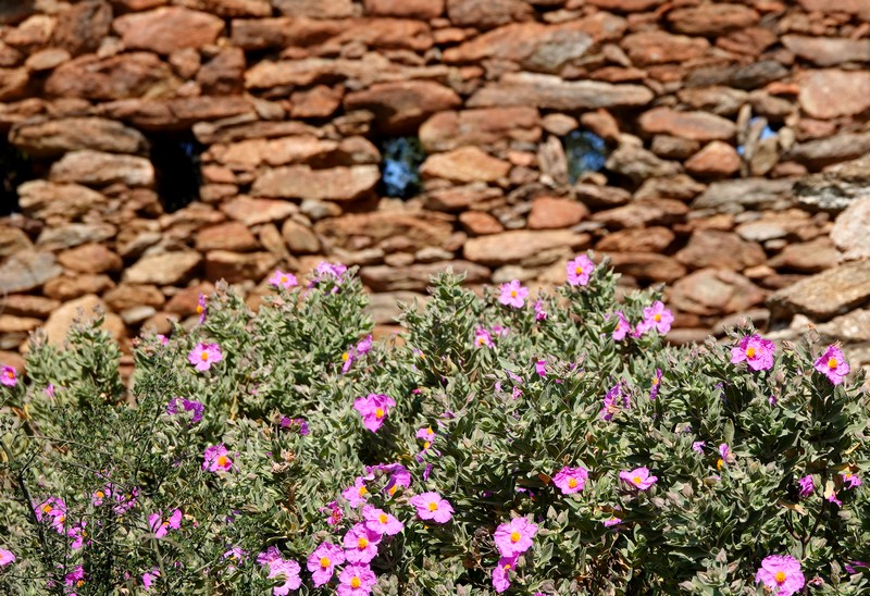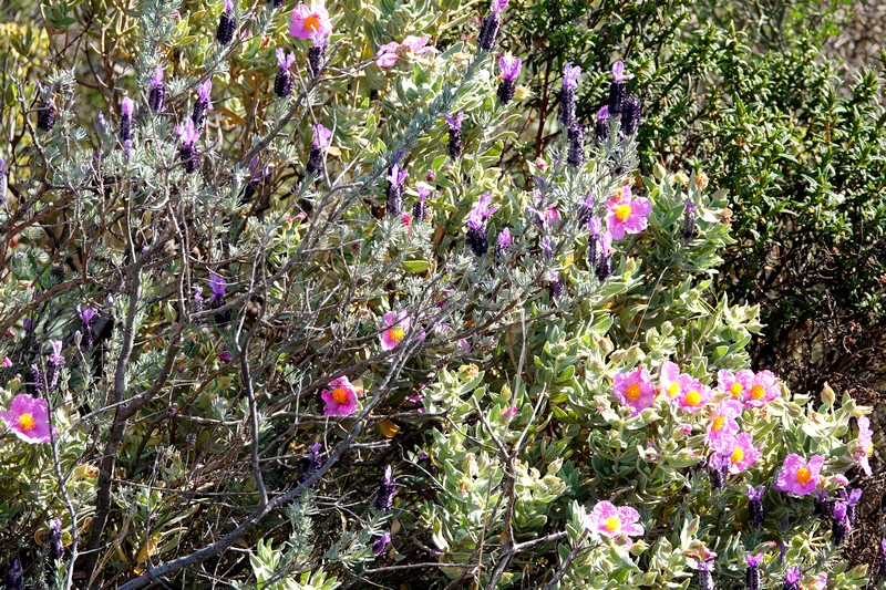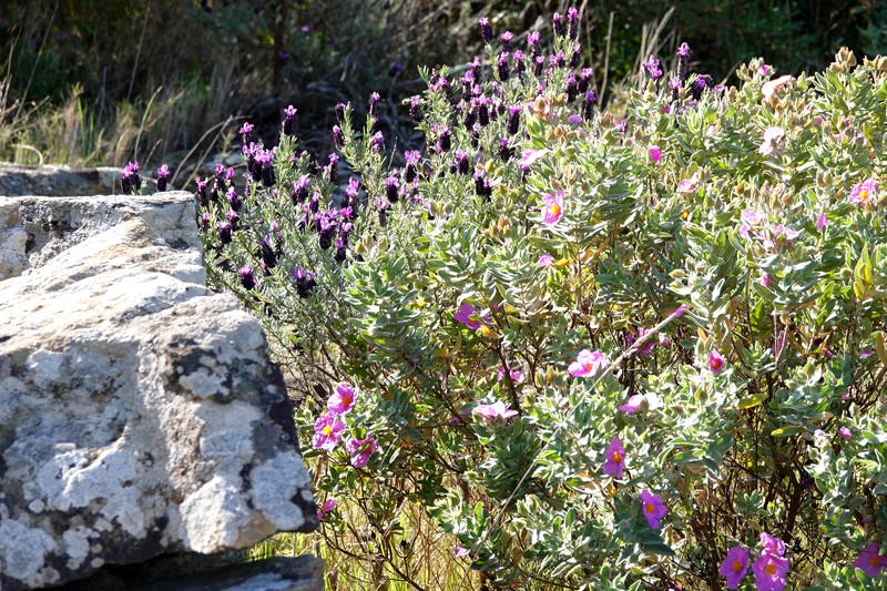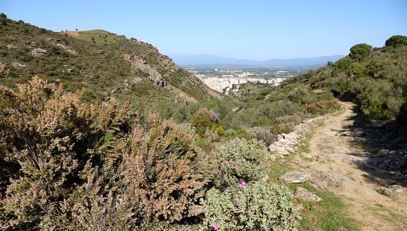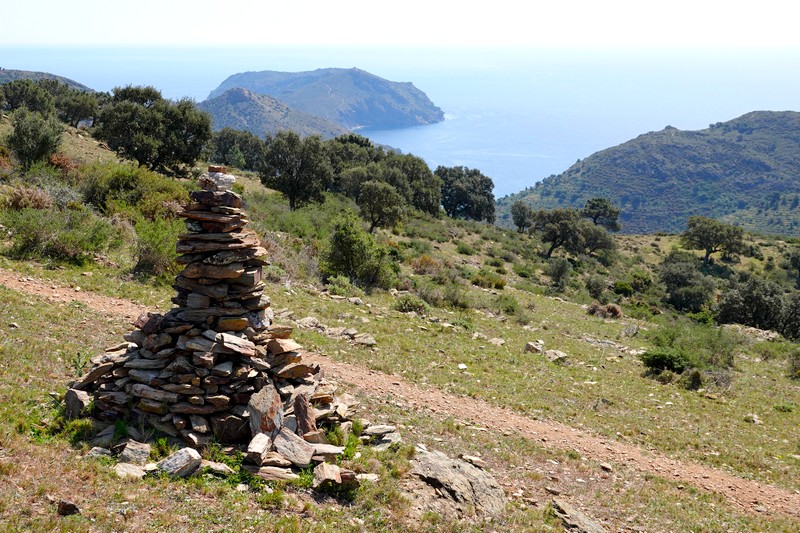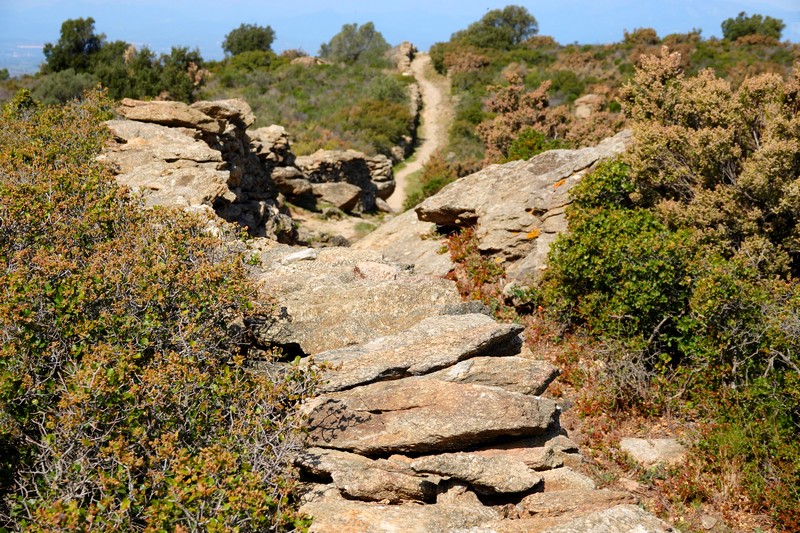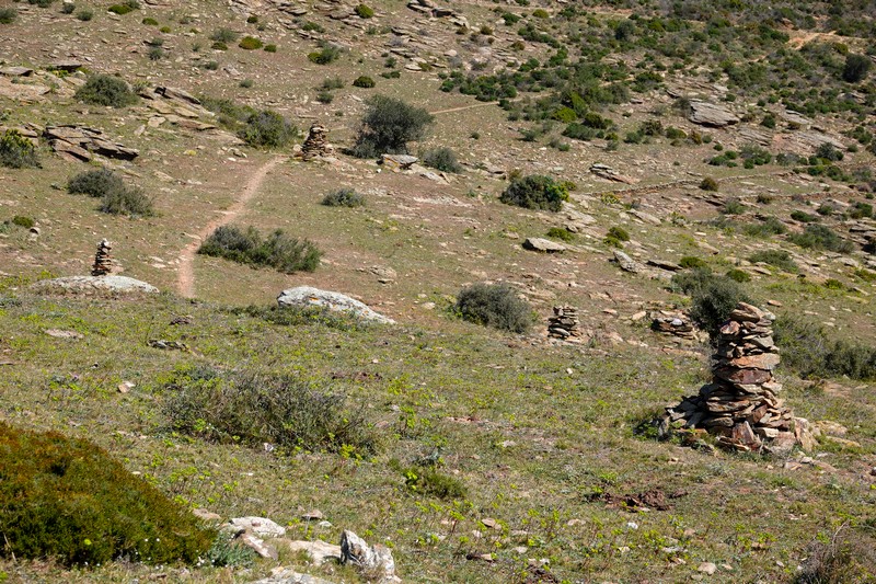 A partir de ce point, deux options sont possibles : soit descendre par la piste qui rejoint Montjoi et rentrer par le sentier côtier, soit emprunter les chemins de traverse de la sierra et rejoindre le Castrum Visigoth avant de plonger directement sur Roses. Pour découvrir de nouvelles vues, on choisit le second itinéraire que l’on n’a encore jamais parcouru. Et c’est reparti, le long d’un sentier bordé par quelques gros cairns, dans une végétation fleurie à souhait…