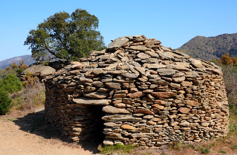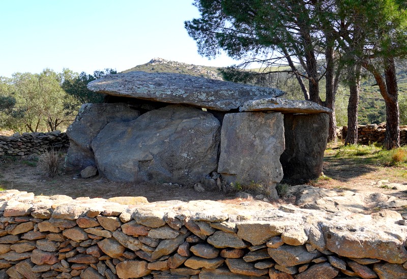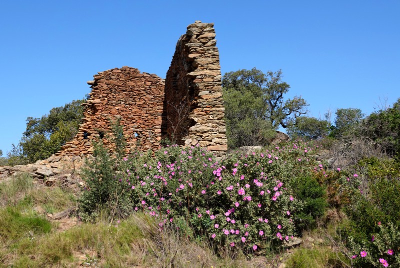 Bien échauffés, nous continuons à monter dans la sierra et suivons maintenant un itinéraire déjà parcouru il y a quelques semaines – Mégalithes et pierres sèches. Et c’est avec plaisir que nous repassons devant le très beau Dolmen de la Creu d’en Cobertella. On poursuit sur un sentier encaissé entre deux murets de pierre, où ça et là, subsistent les ruines d’une activité agricole depuis longtemps abandonnée.