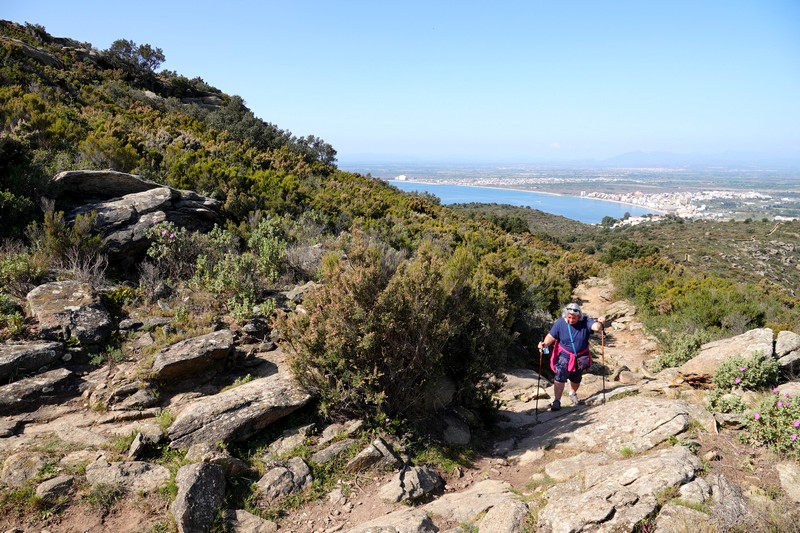 La semaine passée ayant été assez peu active pour cause de vent – oui, encore ! – nous profitons d’une accalmie et d’un grand soleil pour entreprendre une nouvelle rando. Cette fois, point de départ à vélo, c’est à pied que, vers 10h, nous partons du camping ! Nous traversons d’abord Roses, puis nous empruntons la route de Montjoi, avant de bifurquer vers un escalier qui nous mène sur un sentier plus agréable que le bitume. Néanmoins, cette marche d’approche de presque trois kilomètres n’est pas désagréable car à cette heure encore matinale, les cyclistes sont plus nombreux que les véhicules !