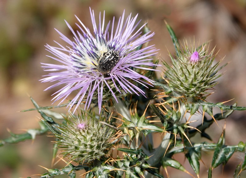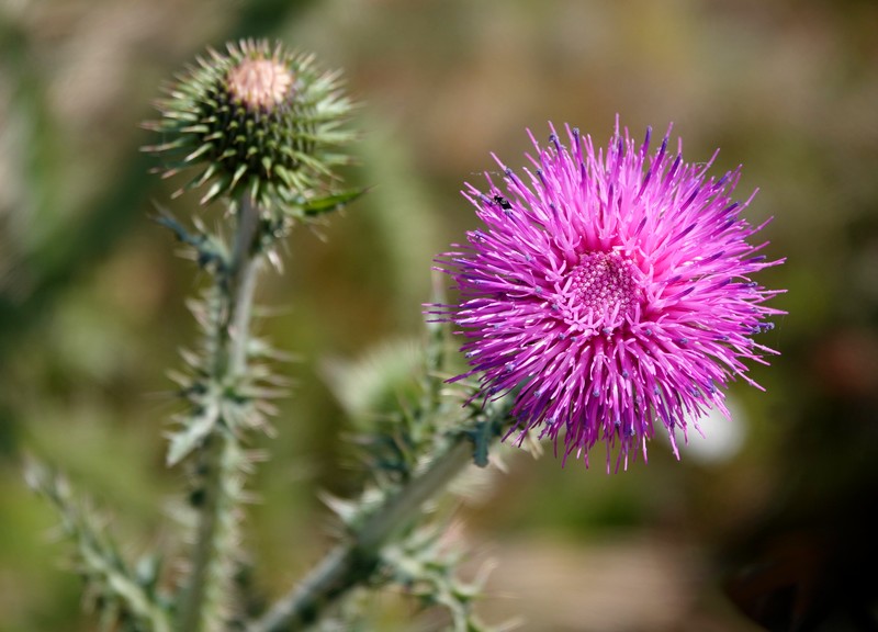 Parvenus au point le plus haut de notre rando, on fait une pause pique-nique, sous l’œil attentif de quelques vaches à l’alpage. Le cadre somptueux, bucolique à souhait – les chardons sont en fleur – et on bénéficie d’une vue plongeante sur la Cala Montjoi… Bref, on ne pouvait trouver plus beau panorama pour déguster notre sandwich !