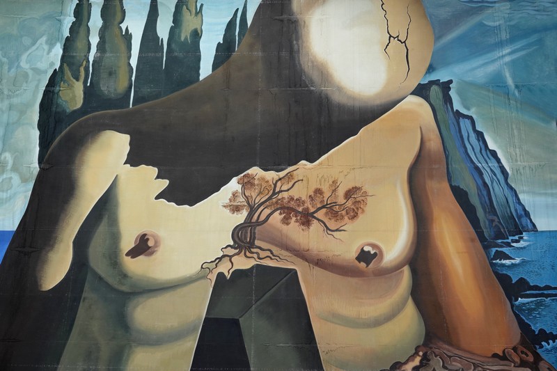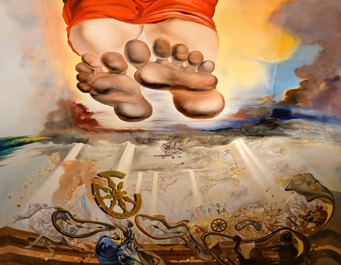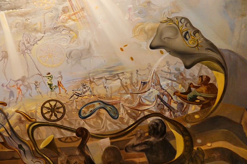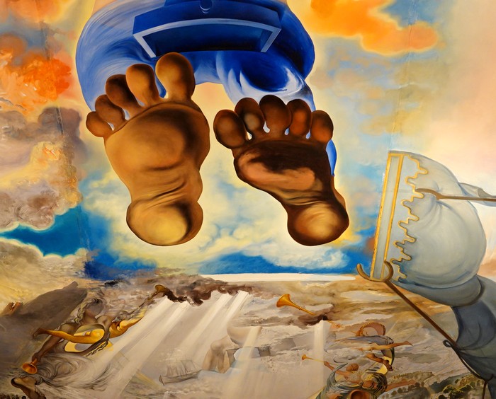 Dernière pièce majeure, la salle du musée du Vent se distingue par la magistrale peinture du plafond représentant les pieds du Maitre et ceux de sa muse, Gala. Réalisée en partie dans sa villa de Portlligat entre 1972 et 1973, Dali achèvera cette toile perché sur de grands échafaudages…