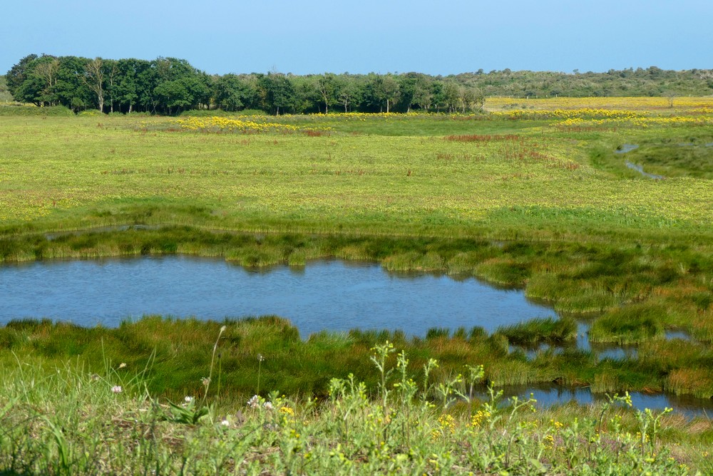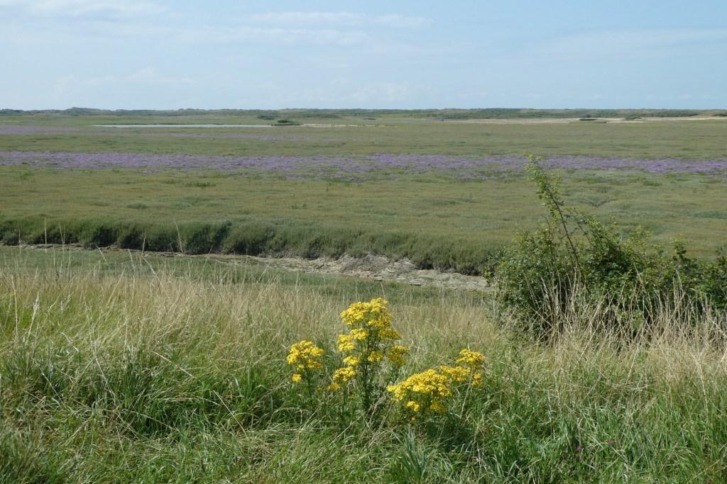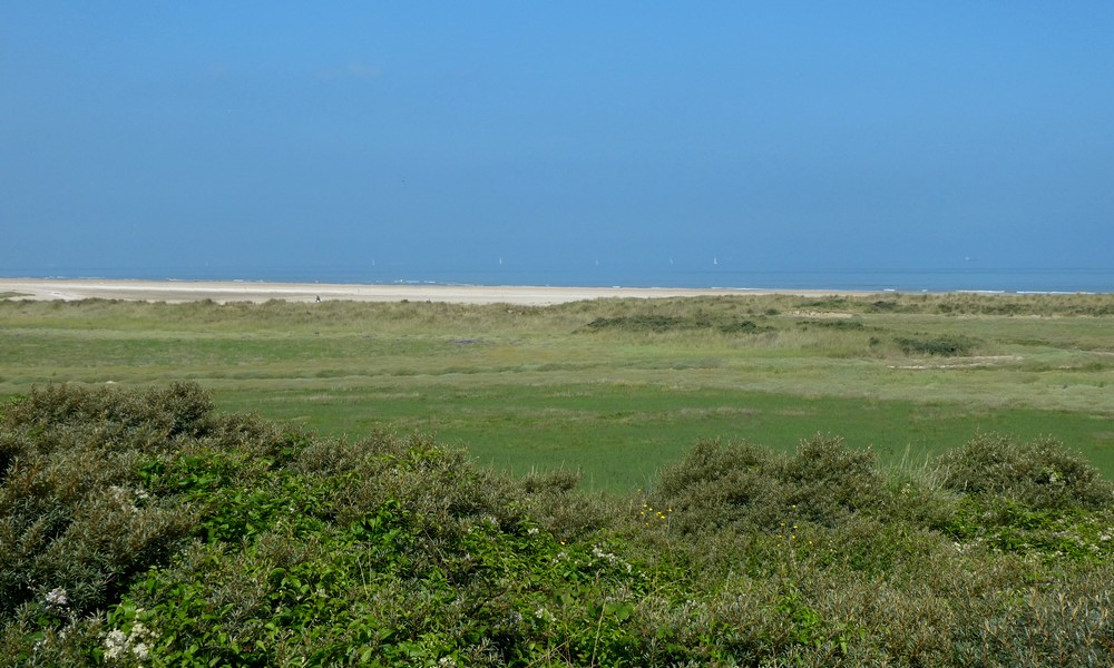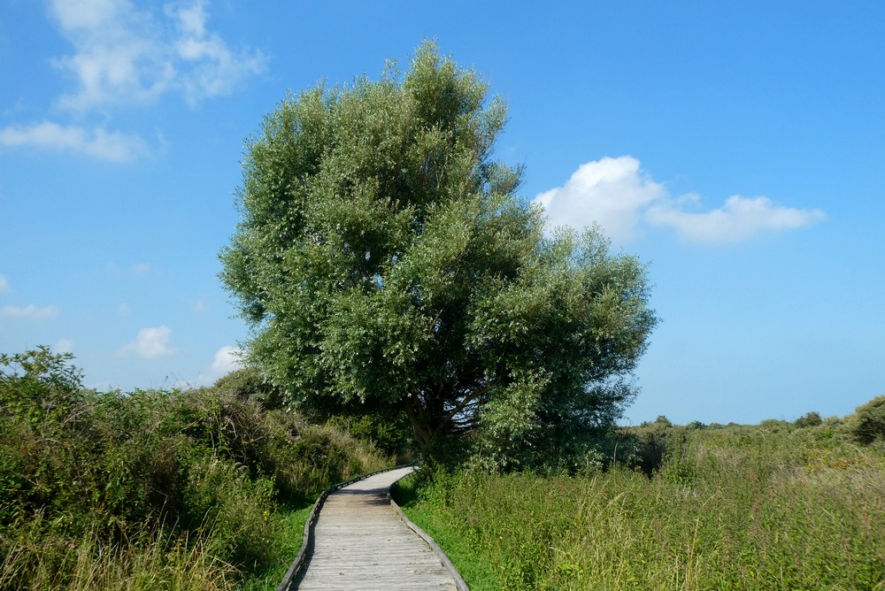 Après un coup d’œil à la carte, nous parvenons finalement à la Maison de la Dune, porte d’entrée de la Réserve naturelle. Une fois les vélos parqués, nous attaquons la boucle du Platier, qui nous fait faire le tour du polder en 4km. Issu du comblement de l’estuaire de l’Aa, qui remontait jusque Saint-Omer, le polder du platier – qui littéralement signifie terrain plat – s’est formé relativement récemment et de manière quasi naturelle. Avec une altitude maximum de 2 mètres au-dessus du niveau marin, les grandes marées peuvent donc l’atteindre…