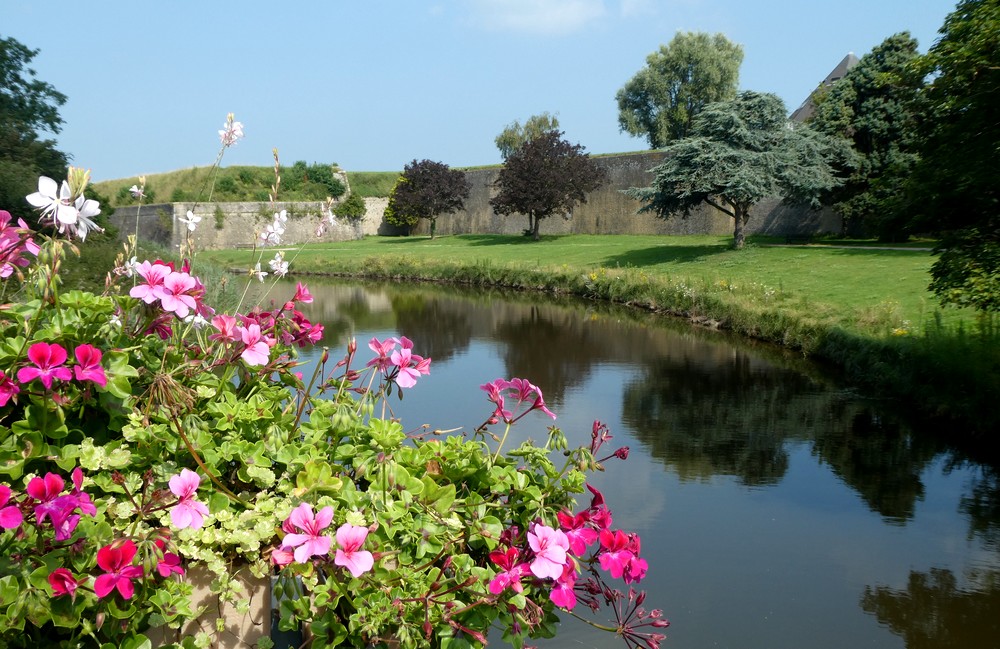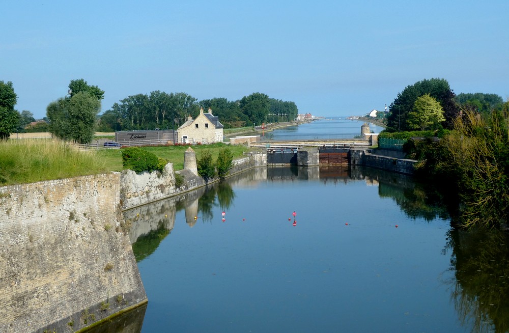 Dès le XIIe siècle, la ville est fortifiée par les Comtes de Flandres, Philippe et Thierry d’Alsace, puis sous Louis XIV, Vauban peaufine l’ouvrage pour lui donner ce plan en étoile que l’on connait actuellement. A l’intérieur de la muraille, il fait installer différents bâtiments militaires. Ainsi, il transforme l’ancien château en garnison, où sont enfermées les armes et les munitions, ainsi qu’un certain nombre d’installations permettant d’envisager un siège : citerne, four, magasin, salles voutées à l’abri des bombes. Ainsi, Gravelines devient – et demeure ! – la seule ville française dotée de remparts entièrement entourés d’eau !