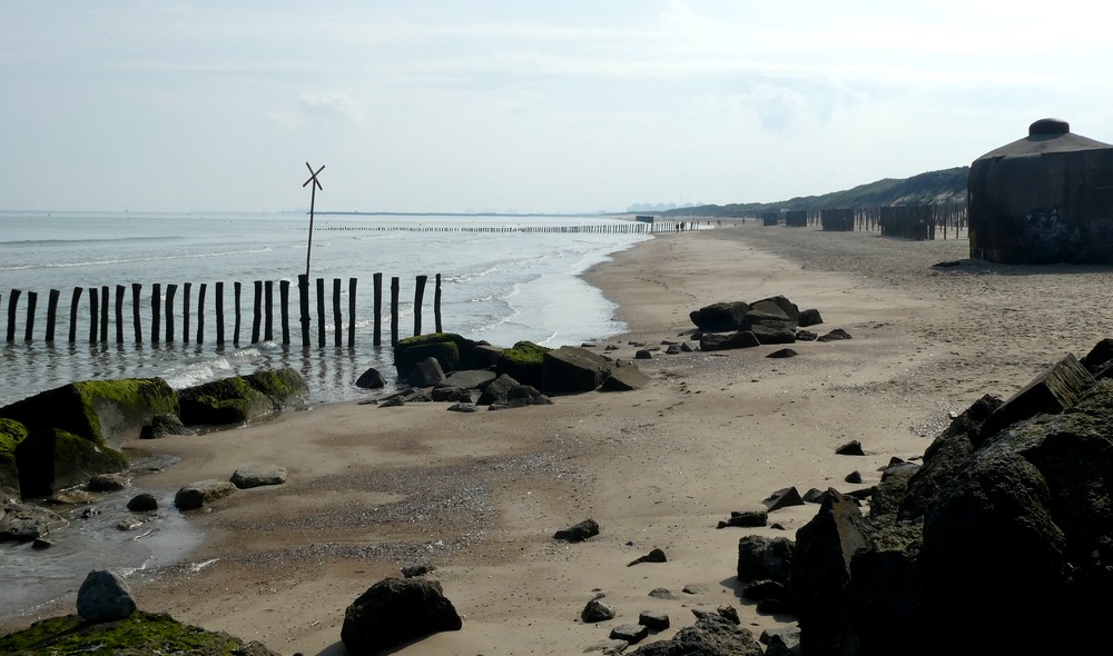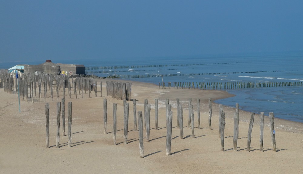 Malgré un ciel un peu voilé au réveil, nous partons à vélo vers la Réserve Naturelle Nationale du Platier d’Oye, toute proche mais située dans le Pas-de-Calais. Eh hop, un petit changement de département, Grand Fort Philippe étant situé dans le Nord. Une erreur de bifurcation nous emmène directement dans le lotissement des Escardines ! Qu’à cela ne tienne, nous commençons par faire un tour sur la longue plage bordée de blockhaus, mémoire visuelle de l’occupation allemande pendant la Seconde Guerre Mondiale…