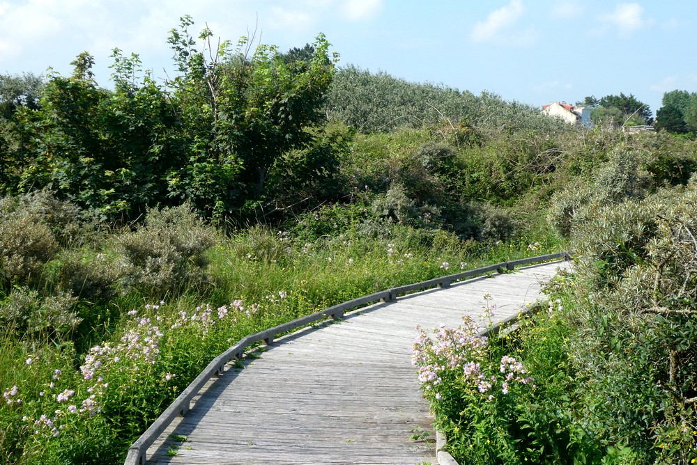 Au départ, le sentier aménagé évolue sur des passerelles basses qui surplombent les marais. Puis, à hauteur de la plage du Casino, le cheminement se fait dans le sable. C’est nettement moins agréable, d’autant que l’on marche entre deux hautes haies d’épineux qui masquent le paysage environnant.
