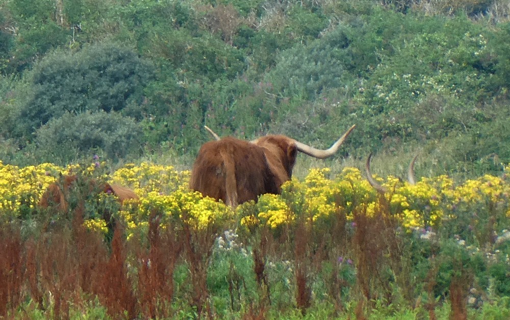 Et un peu plus loin, on aperçoit les cornes des grosses vaches Highland qui entretiennent naturellement les prairies…
