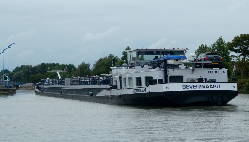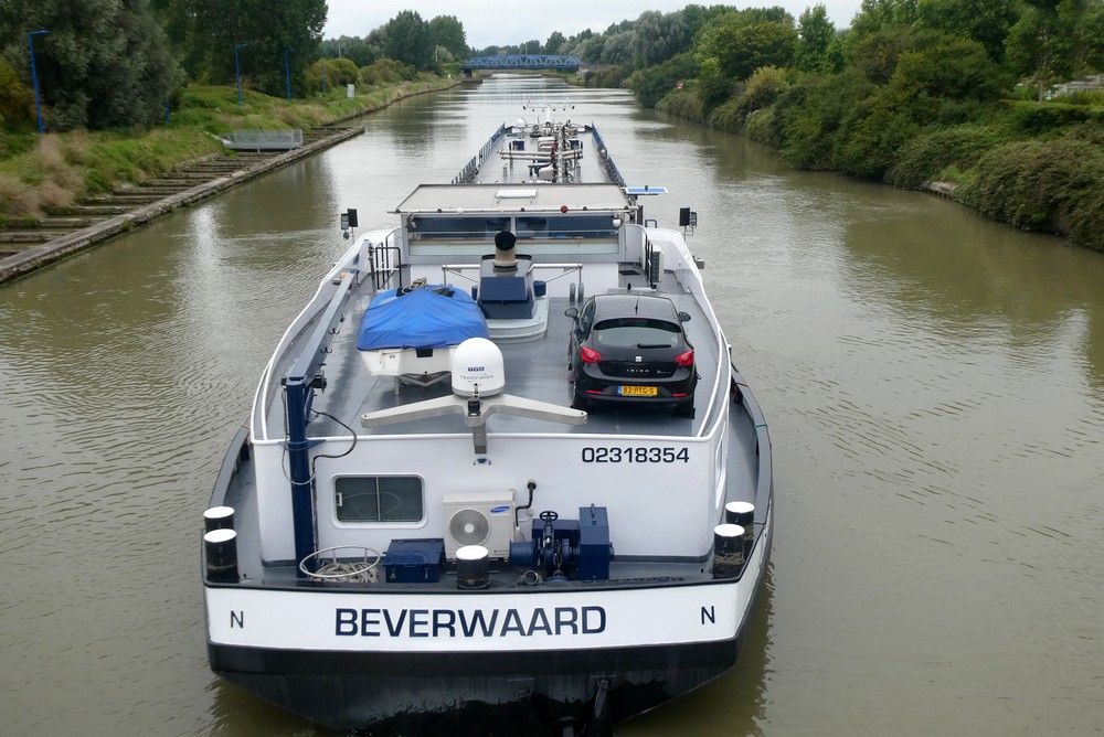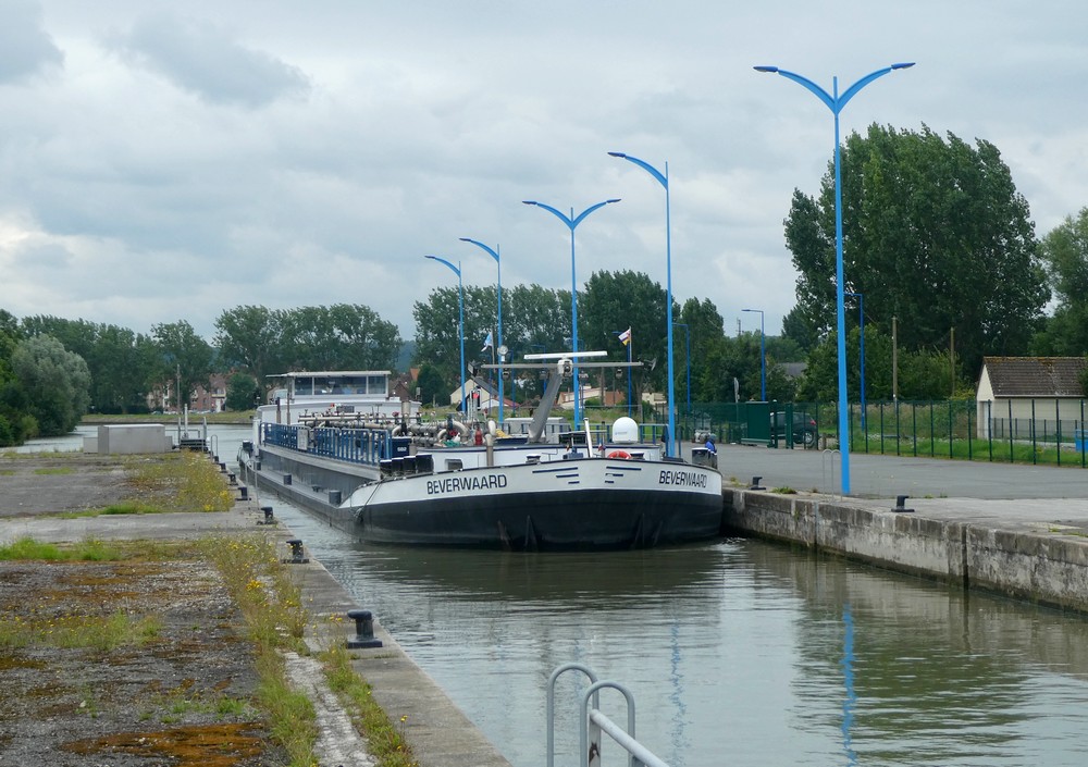 On rentre au camping en longeant le canal de Neufossé qui, sur cette partie, est emprunté par de très grandes péniches qui relient Lille à Dunkerque. L’une d’entre elles – 100m de long – se présentant devant l’écluse, on passe un bon moment à observer la manœuvre…