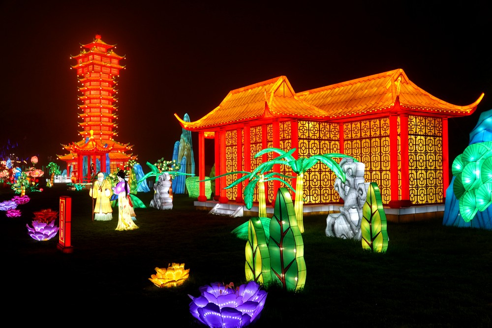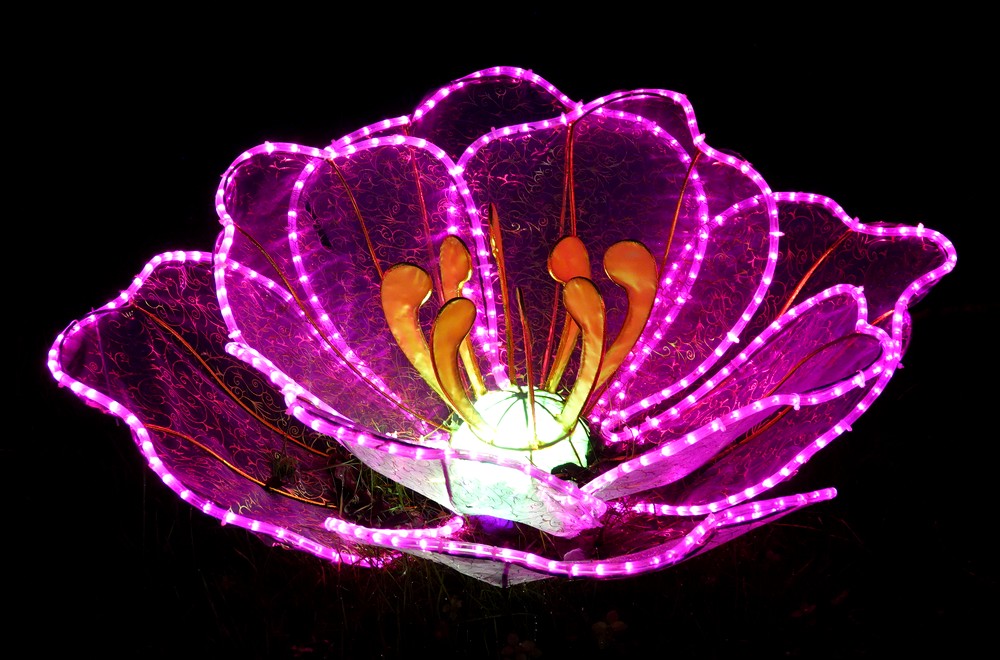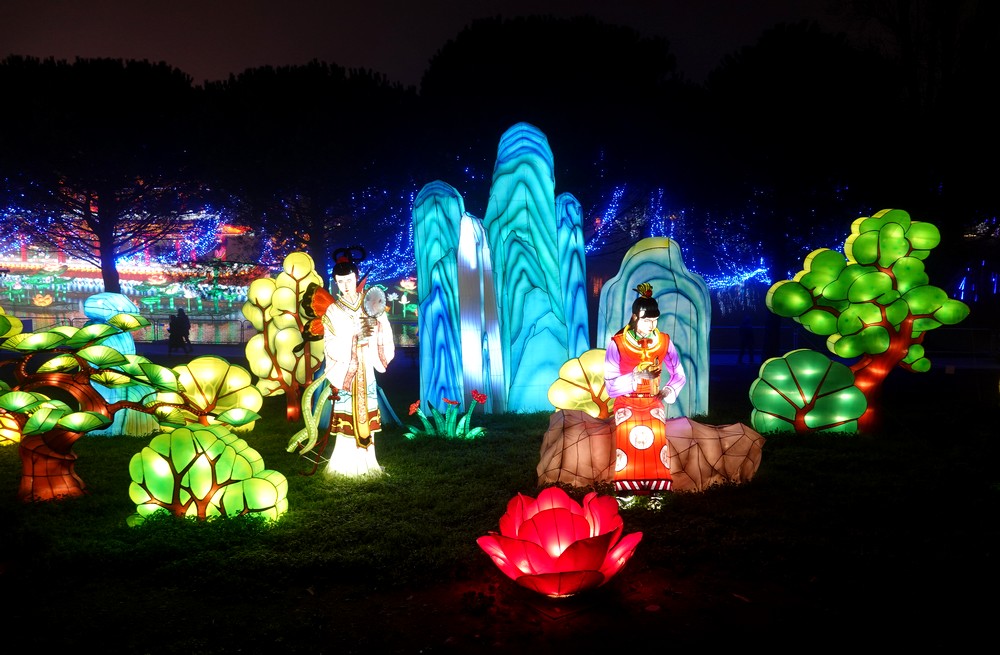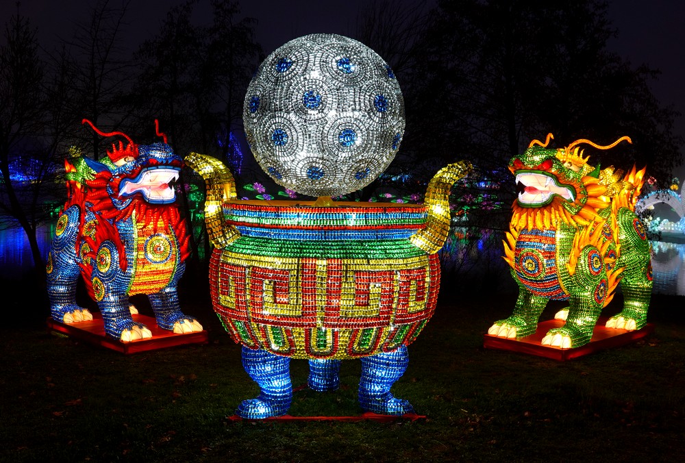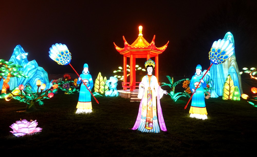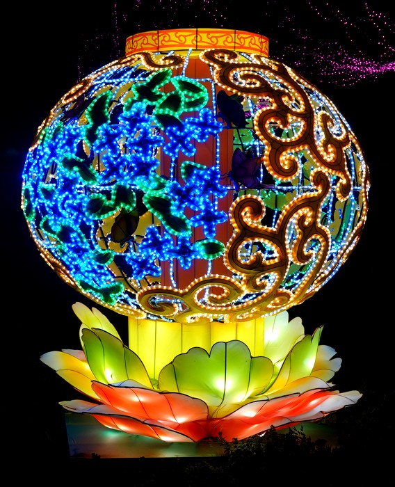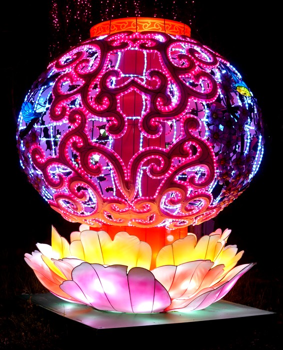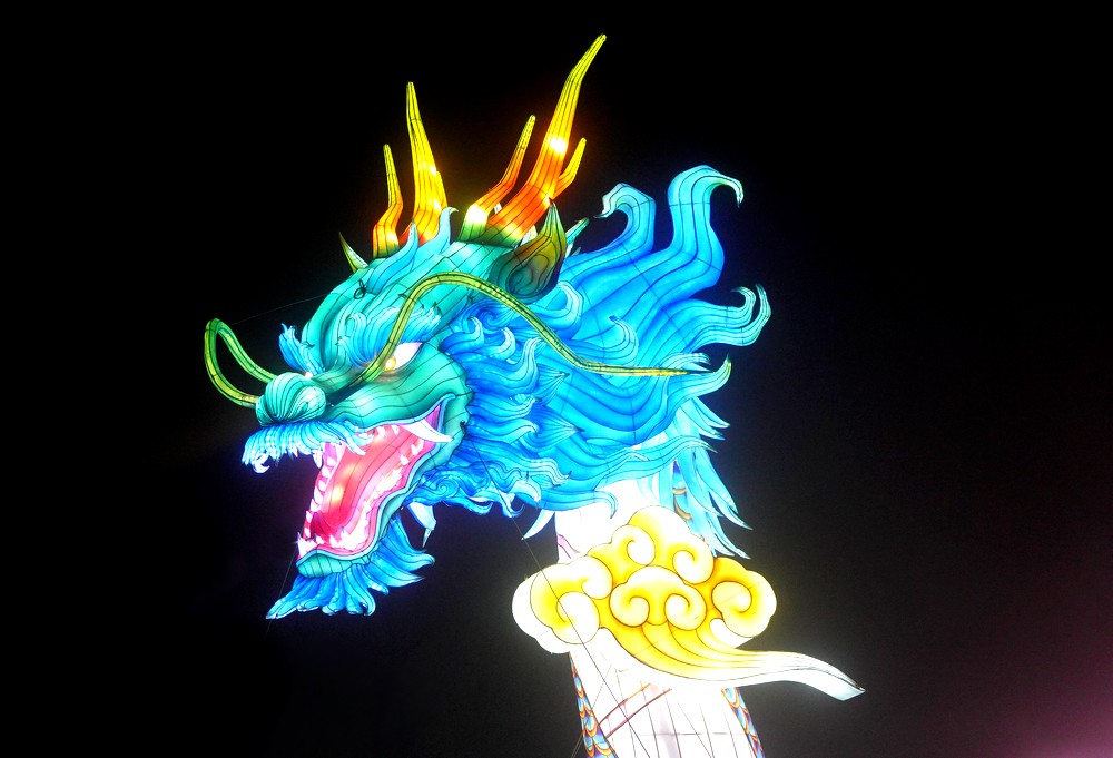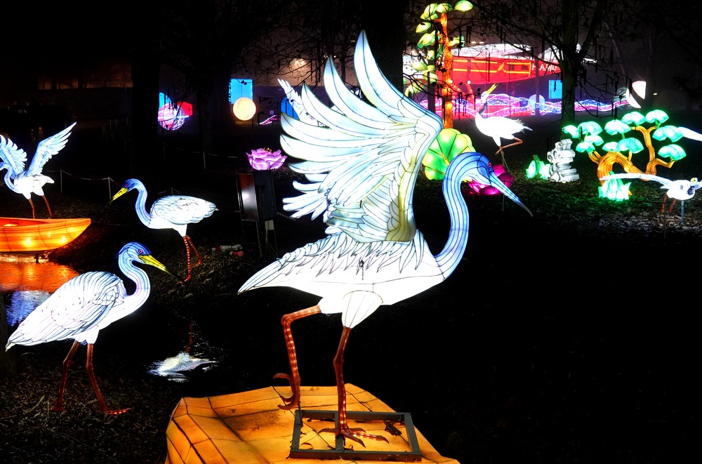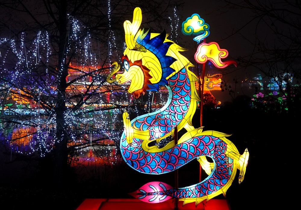 Vers 16h30, nous partons du camping à vélo en direction de Blagnac, commune limitrophe à Toulouse et célèbre pour son industrie aéronautique. Pour l’heure, ce ne sont pas les Airbus qui motivent notre pédalage, mais le Festival des Lanternes qui, pour la première fois, s’est invité dans le parc du Ritouret. A 18h tapante, nous pénétrons sur le site et immédiatement, nous sommes conquis par cette féérie de couleurs ! sur les huit hectares du domaine, pas moins de 45 structures lumineuses – monumentales pour certaines – et recouvertes de soie ont été installées par des artisans chinois de la ville de Zigong, dans la province du Sichuan. En effet, c’est à Zigong que fut créé le festival des lanternes chinois, sous la dynastie Tang, entre le VIIe et Xe siècle. Festival s’est ensuite exporté à Pékin, Hong-Kong et Shanghai, pour enfin parvenir à Blagnac le 1er décembre 2021 ! Les opportunités des photos étant multiples, nous avons décidé de consacrer un article spécial à ce festival carrément extraordinaire, et une fois n’est pas coutume, cette publication est entièrement visuelle !