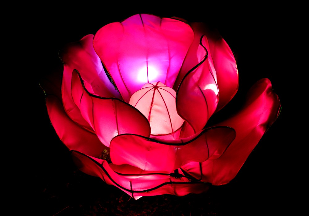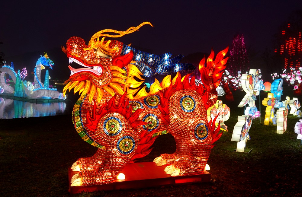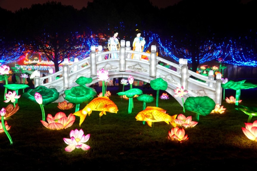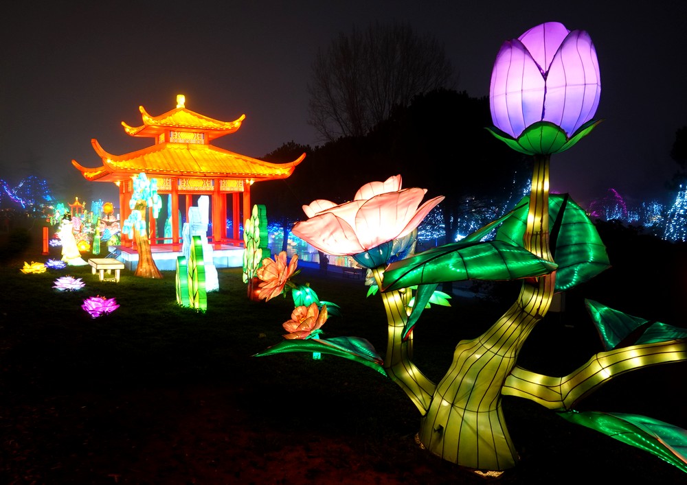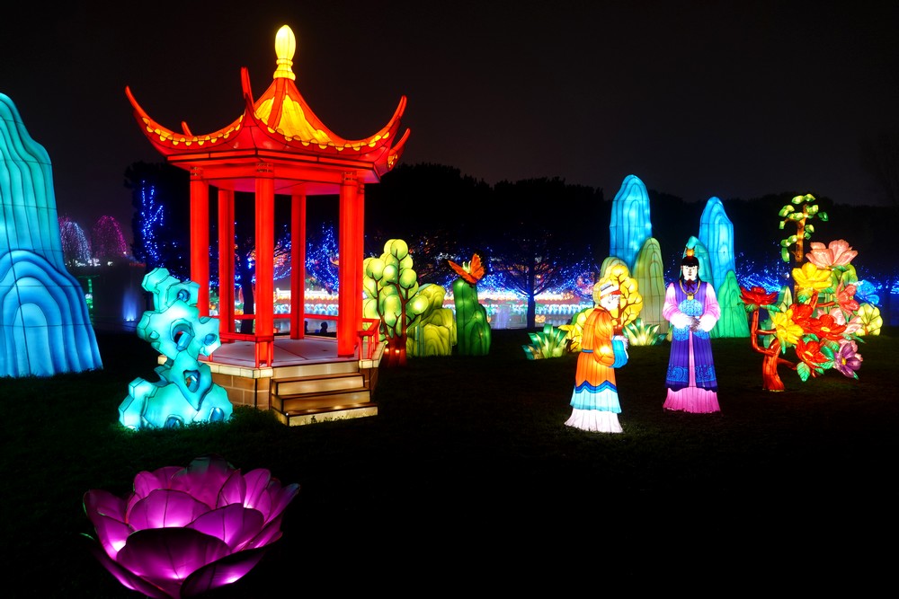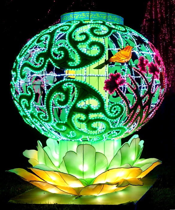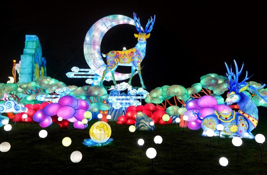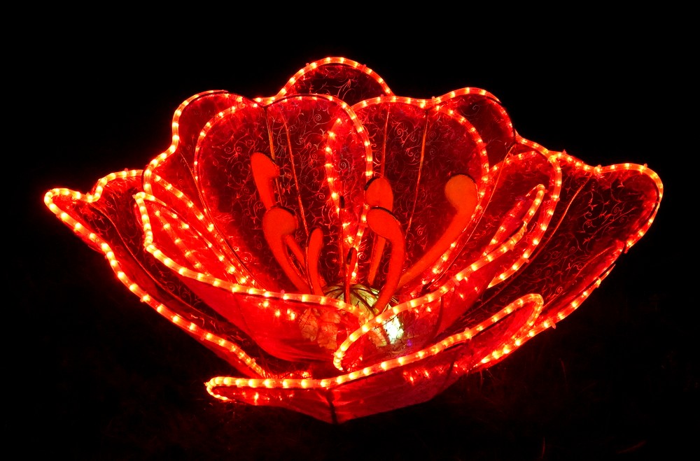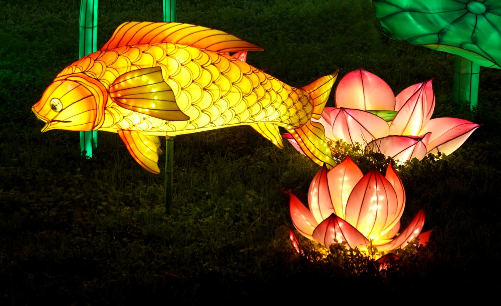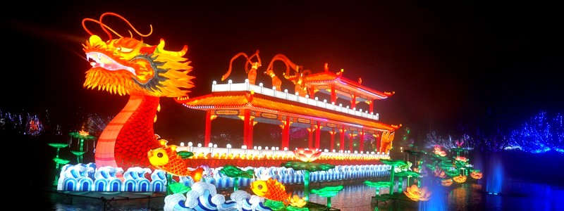 Vers 16h30, nous partons du camping à vélo en direction de Blagnac, commune limitrophe à Toulouse et célèbre pour son industrie aéronautique. Pour l’heure, ce ne sont pas les Airbus qui motivent notre pédalage, mais le Festival des Lanternes qui, pour la première fois, s’est invité dans le parc du Ritouret. A 18h tapante, nous pénétrons sur le site et immédiatement, nous sommes conquis par cette féérie de couleurs ! sur les huit hectares du domaine, pas moins de 45 structures lumineuses – monumentales pour certaines – et recouvertes de soie ont été installées par des artisans chinois de la ville de Zigong, dans la province du Sichuan. En effet, c’est à Zigong que fut créé le festival des lanternes chinois, sous la dynastie Tang, entre le VIIe et Xe siècle. Festival s’est ensuite exporté à Pékin, Hong-Kong et Shanghai, pour enfin parvenir à Blagnac le 1er décembre 2021 ! Les opportunités des photos étant multiples, nous avons décidé de consacrer un article spécial à ce festival carrément extraordinaire, et une fois n’est pas coutume, cette publication est entièrement visuelle !