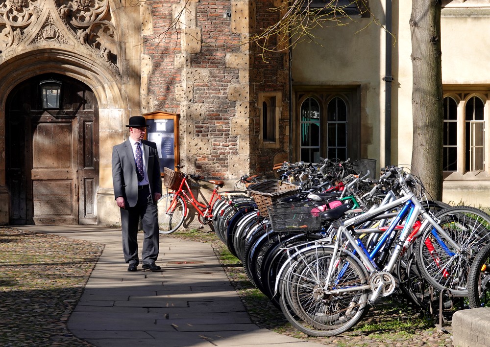 Impatients de découvrir la mythique ville universitaire, nous sommes sur les vélos dès 8h30 ! Pas de bol, le ciel affiche un gris désespérant, mais pour l’instant il ne pleut encore pas… Premier constat : ici, la petite reine a la cote et nous sommes nombreux à pédaler vers le centre : logique, car avec environ 22.000 étudiants – dont 25% venant de l’étranger – Cambridge est une cité très dynamique ! Pour la petite histoire, il faut savoir que ce statut universitaire remonte à 1209, quand de nombreux étudiants fuirent les émeutes d’Oxford pour se réfugier dans la petite bourgade. Le premier college ouvrit ses portes en 1289, et dès 1318 une autorisation papale autorisa que l’on y délivre les diplômes – college signifiant ici université. Bien que certains établissements aient été créés par des femmes, ce n’est qu’en 1869 que les premières d’entre elles furent admises à y étudier – et elles durent tout de même attendre 1948 pour avoir le droit d’obtenir un diplôme. Quant à la mixité, longtemps elle ne fut pas de mise, 1988 étant la date à laquelle le dernier collège se décida – enfin ! – à rompre avec cette tradition sexiste.