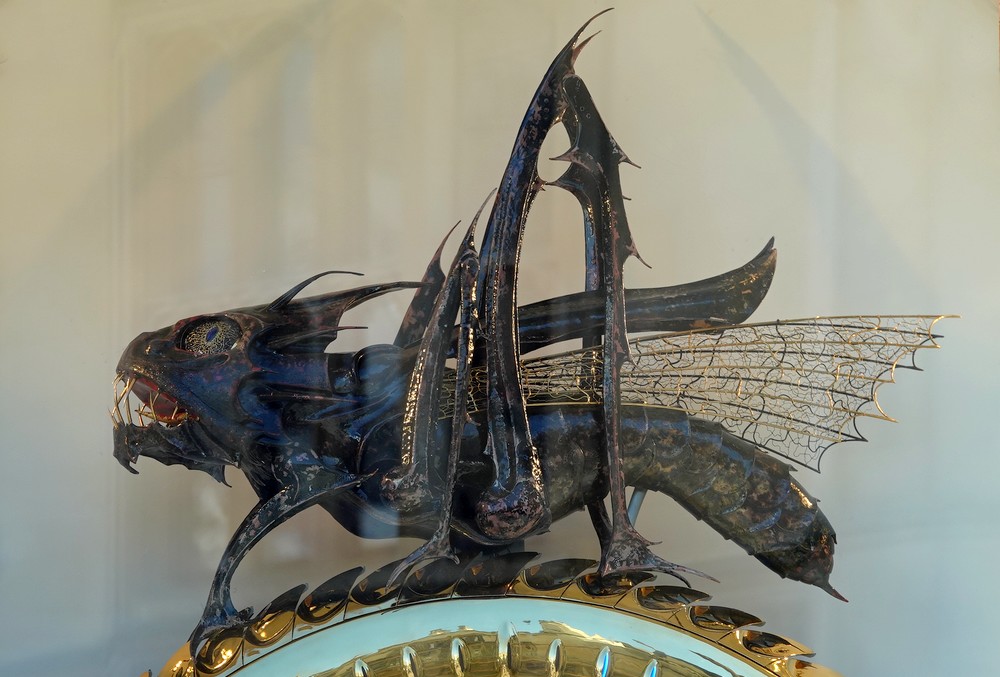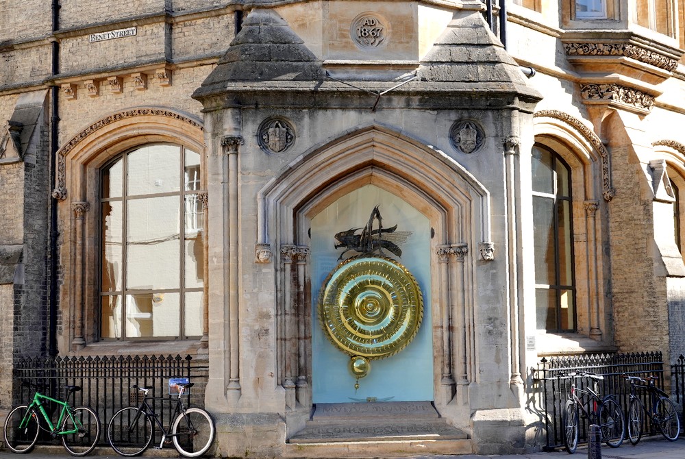Comme aucune table en terrasse n’est libre, on s’installe sur le muret de l’université pour prendre notre dessert, en l’occurrence un short bread et un brownie ! Puis on va admirer Corpus Clock, une grosse horloge sculpturale inaugurée en 2008. Plaquée or, elle ne possède ni aiguilles ni chiffres, mais elle affiche l’heure à l’aide de signaux lumineux, et un monstre-criquet-chronophage surmonte le cadran. Original !