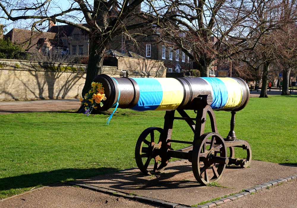Avant de partir à la découverte de la cathédrale, nous faisons un tour dans le petit jardin qui lui fait face : un ancien canon russe, capturé pendant la guerre de Crimée de 1853-1856, aujourd’hui recouvert du drapeau ukrainien.