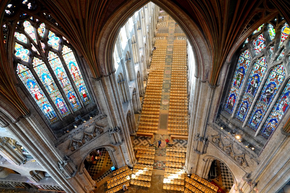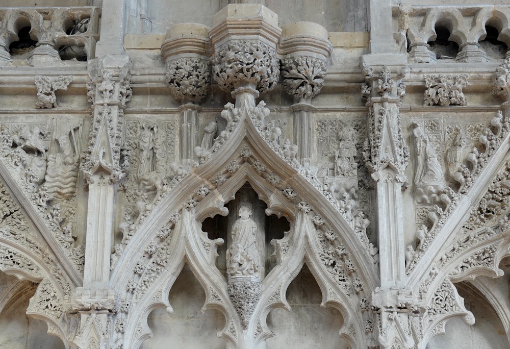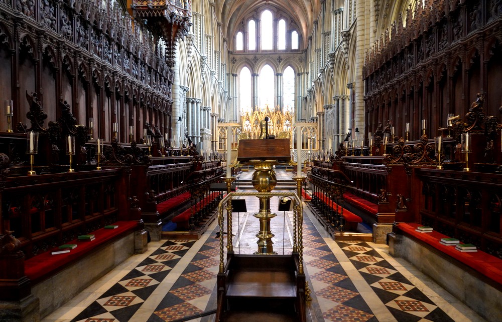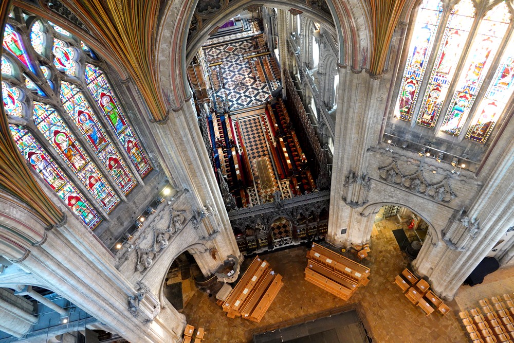 On fait un dernier tour dans la Lady Chapel, la plus grande chapelle jamais consacrée au Royaume-Uni, édifiée au Nord et presque détachée de la cathédrale elle-même. Achevée en 1375, sa verrière aux sept vitraux lui confère une luminosité exceptionnelle. Malheureusement, les 200 statues qui ornaient les murs ont été décapitées lord de la Réforme, en 1541.