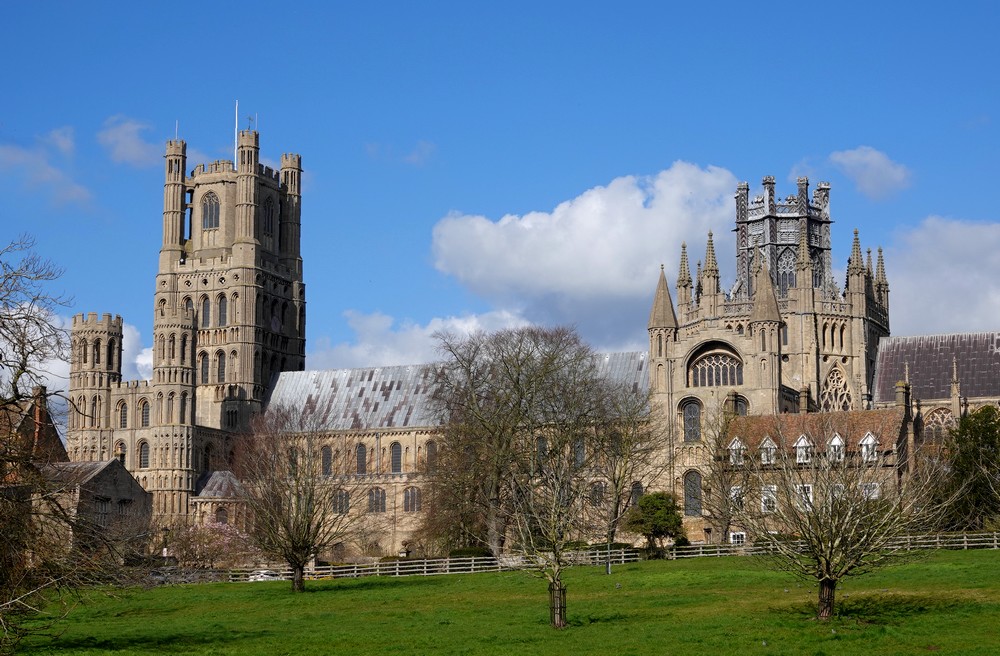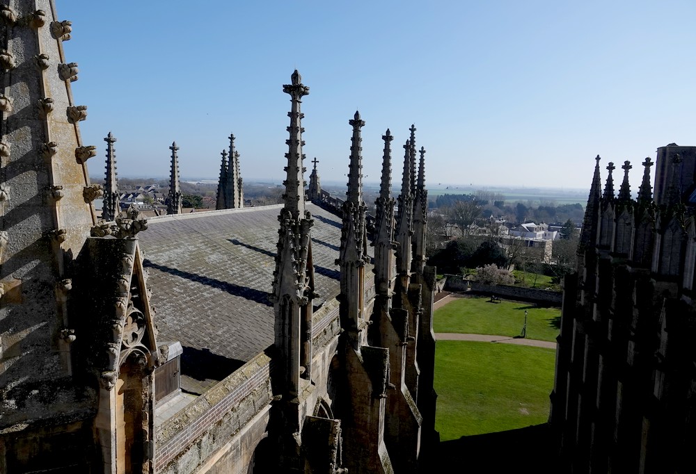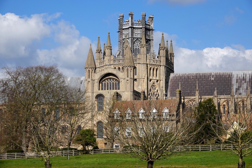 Toujours sous un ciel bleu vif, à 7h45 nous sommes sur les vélos et pédalons jusqu’à la gare de Cambridge où nous nous garons. Puis nous enchainons avec un trajet de 20mn en train, en direction d’Ely, une petite ville située à environ 25km au nord. Objectif de la matinée : la visite de la cathédrale de la Sainte-et-Indivisible-Trinité, une des plus anciennes de Grande-Bretagne !