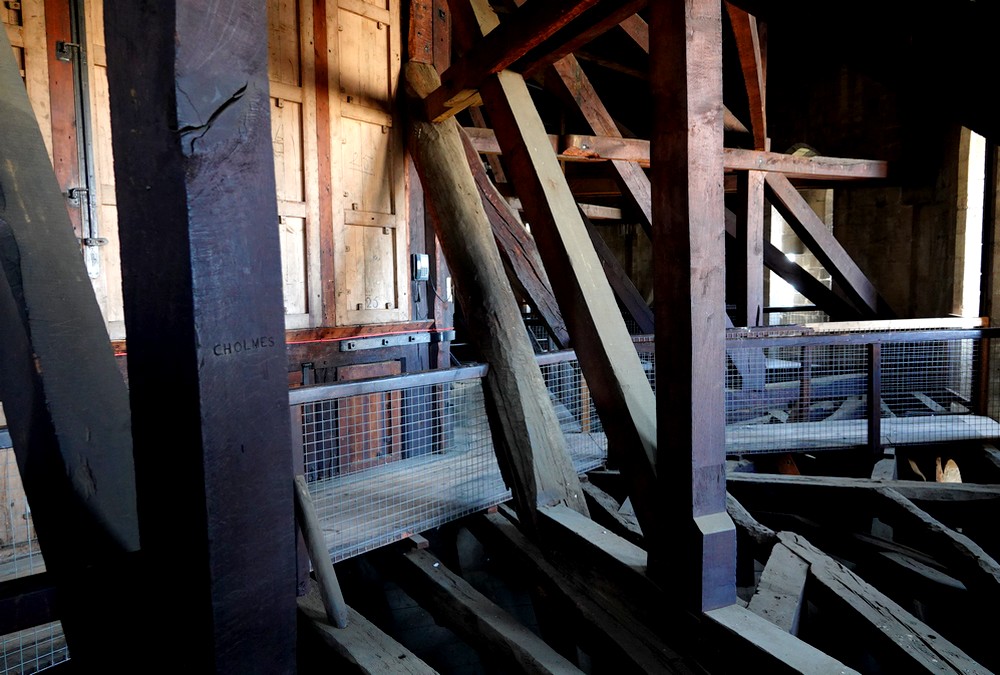 Nous ne sommes pas mécontents, 170 marches plus haut, de déboucher à l’intérieur de la grande tour octogonale en pierre ! Avec ses huit piliers, elle supporte une spectaculaire charpente en bois d’une grande complexité, utilisant de très grands arbres.