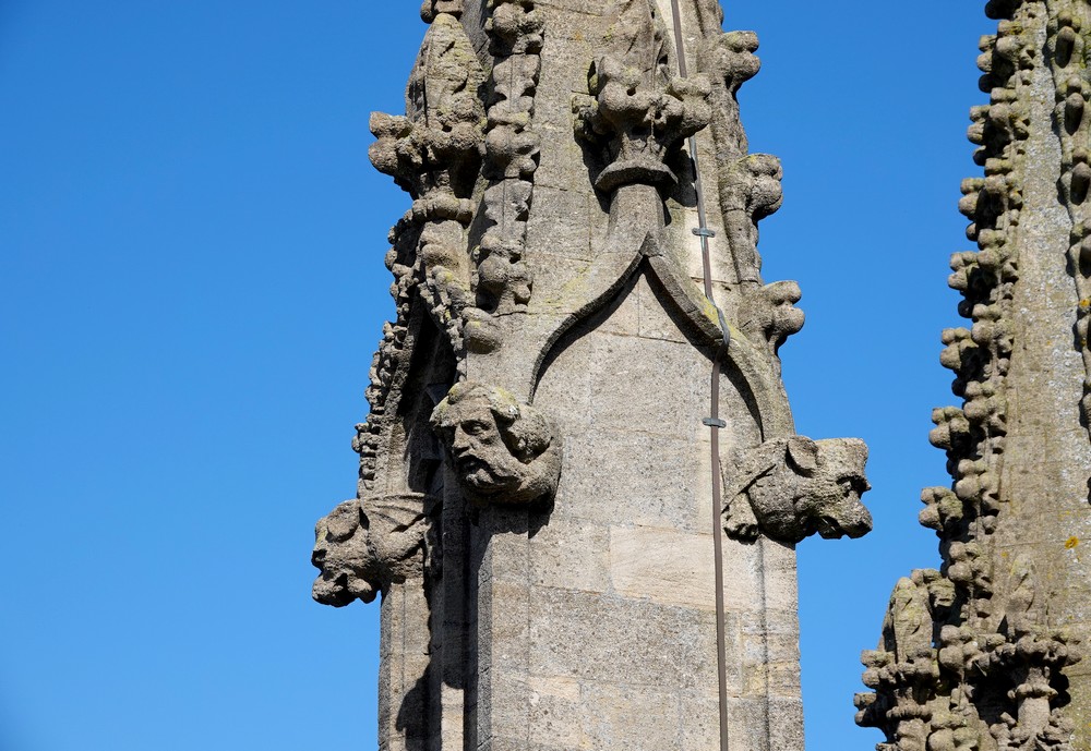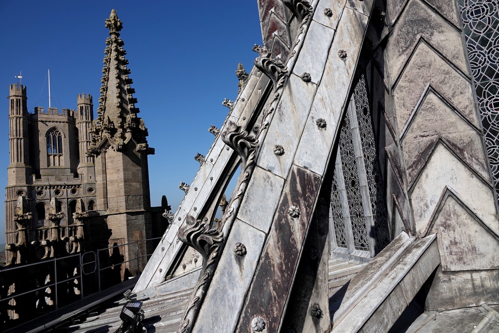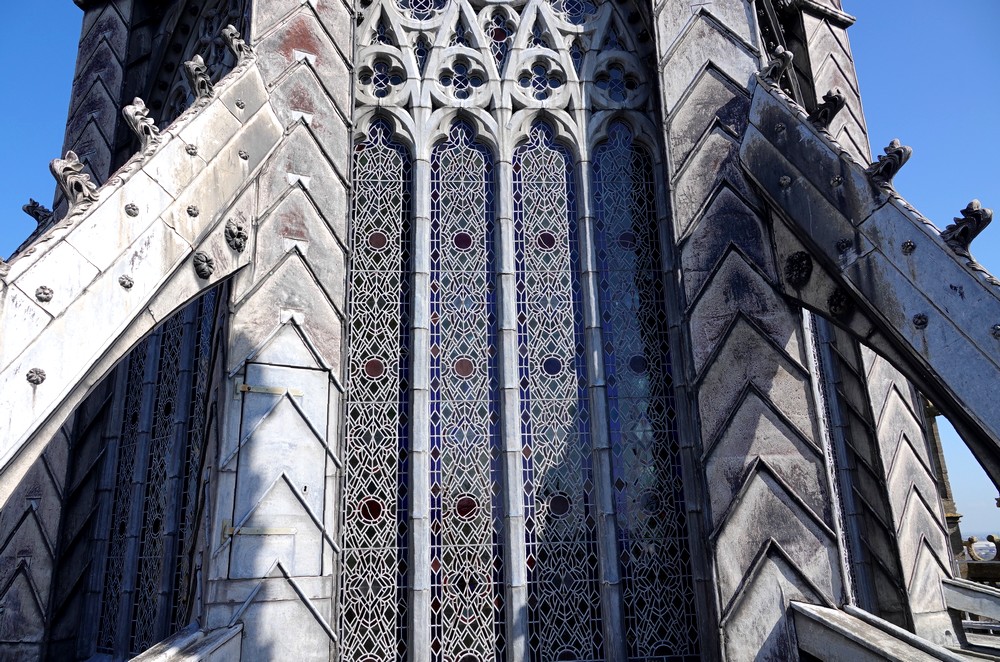Encore quelques tours d’escalier en colimaçon – de plus en plus étroit ! – et nous voilà sur la coursive extérieure de la tour Octogone. Observant l’architecture de près, on comprend immédiatement que celle-ci est en partie recouverte de plomb : splendide !