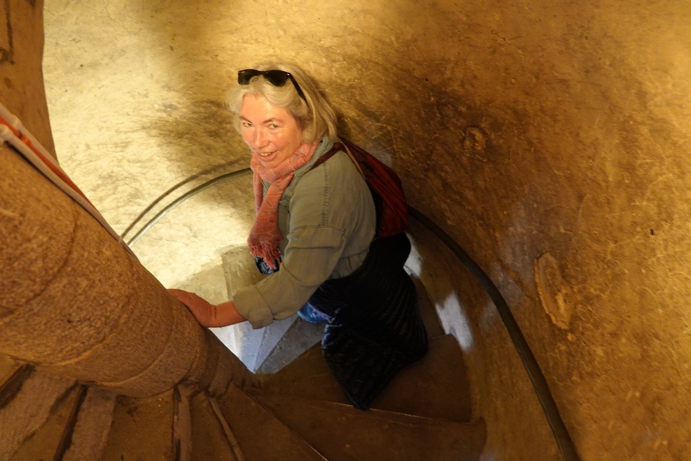 Après un arrêt à un premier palier extérieur qui nous permet de profiter d’une belle vue sur l’édifice, nous poursuivons l’ascension. Et quelle ascension : rarement nous avions vu porte si étroite et escaliers si abrupts dans lesquels seule une personne passe, et encore pas facilement !