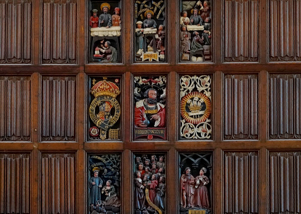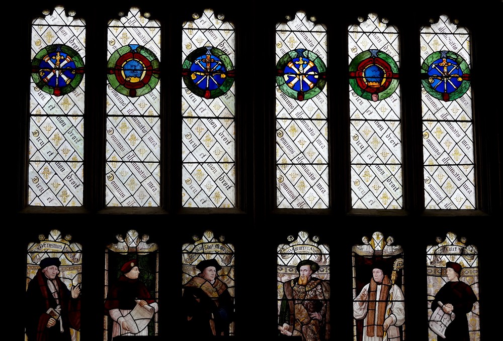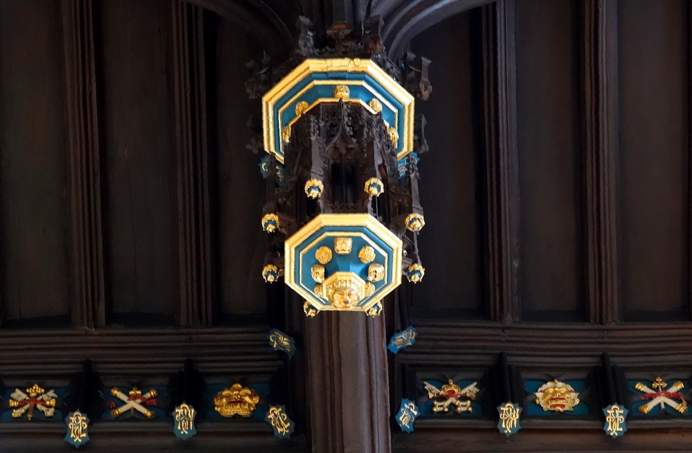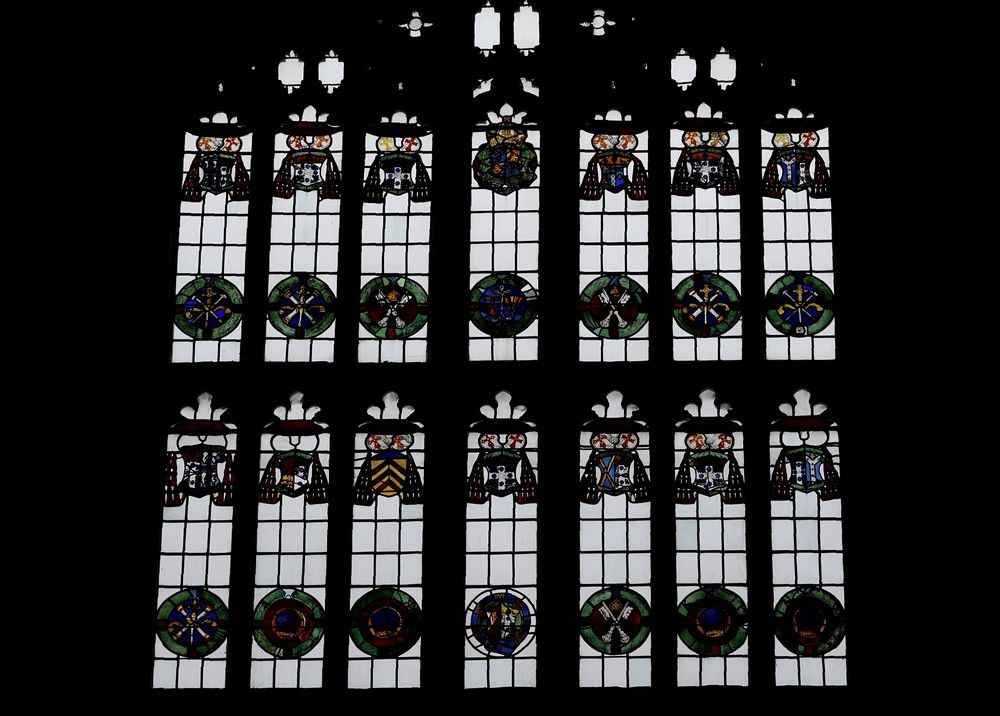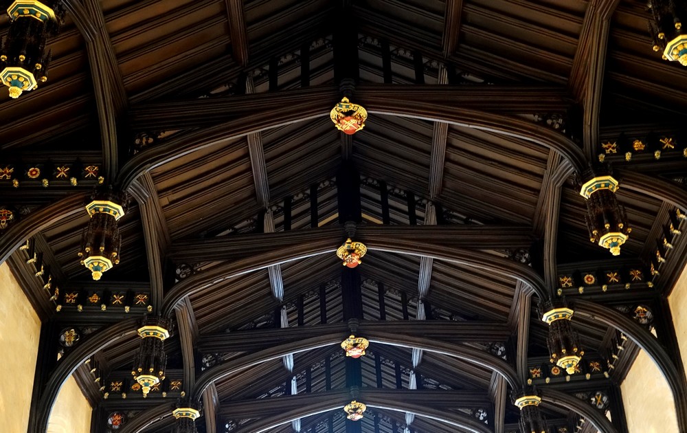 Tout dans ce Hall attire le regard, que ce soit le plafond, exemple parfait de poutres à marteaux du XVIe siècle, ou encore les vitraux, achevés en 1985 et superbes de délicatesse, qui rappellent la présence dans les lieux de certaines personnalités.