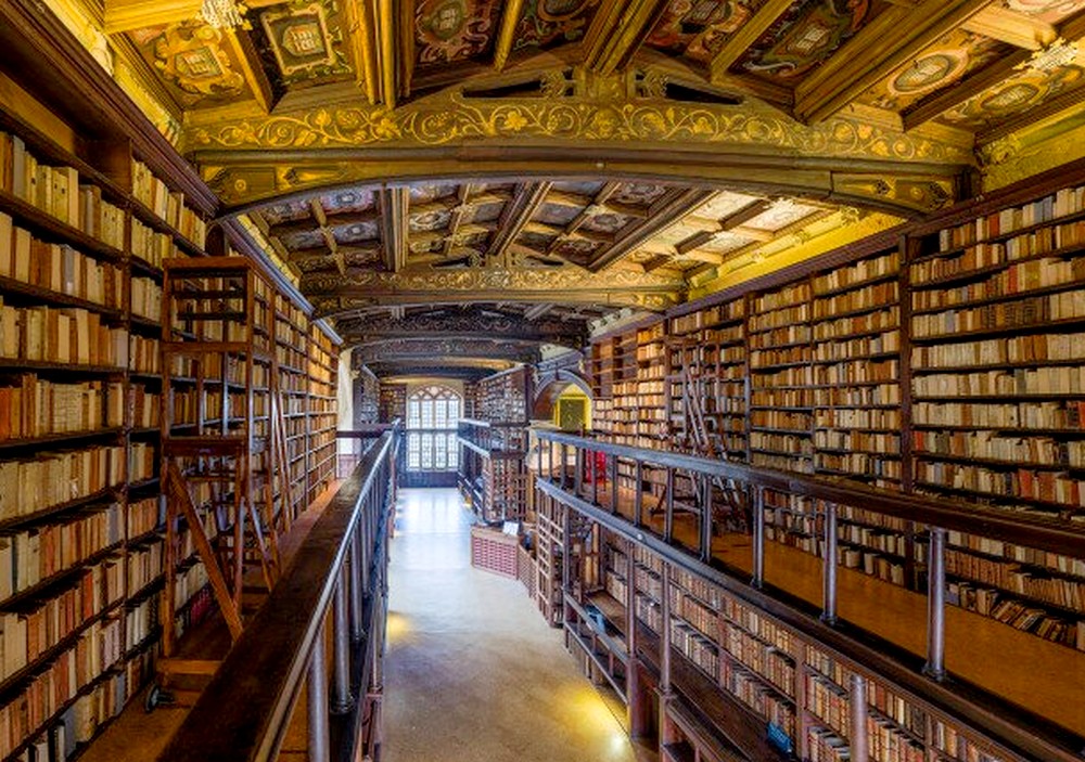 A 14h, nous nous joignons à un petit groupe pour suivre la visite obligatoirement guidée de la Bodleian Library, la plus prestigieuse des bibliothèques de l’université d’Oxford, établie en 1602. Sur ses différents sites, elle rassemble plus de 13 millions de livres imprimés ; elle conserve aussi des collections importantes de documents anciens : manuscrits, papyrus, cartes ou dessins. La partie que nous visitons est la plus ancienne, et est encore en activité, d’où l’interdiction de prendre des photos (cliché ci-dessous pris sur internet). Quel cadre somptueux pour étudier !