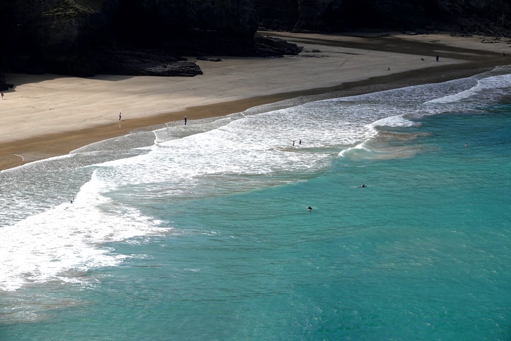 Remise de mes émotions, nous nous baladons un bon moment sur le sable mouillé en observant les surfeurs et quelques baigneurs qui ne craignent pas l’eau à 9°C ! Alors que nous pensions regagner le sentier côtier par la même voie, nous découvrons à l’autre bout de la plage un chemin bien plus facile et accessible à tous sans difficulté !