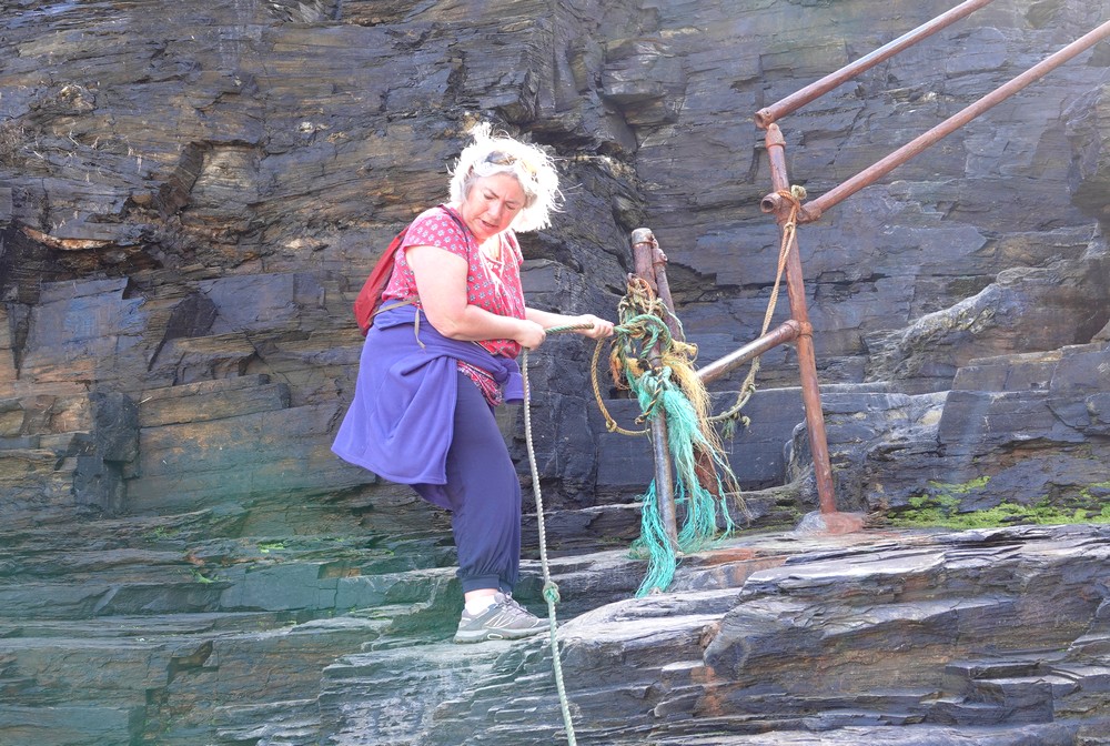 Alors que nous approchons du but, les choses se corsent subitement. Les marches de pierre se font de plus en plus irrégulières, et surtout très glissantes ! Heureusement une main courante métallique est là pour faciliter la descente. Mais alors que le sable n’est plus qu’à une dizaine de mètres en contrebas – ça parait peu dit ainsi, mais en fait c’est haut, dix mètres ! – la solide barre de fer est remplacée par une corde ! Si Gérard passe très facilement, dès le départ, mes jambes font un refus : alors que grimper ne me pose aucun problème, cela fait 50 ans que tout ce qui ressemble de près ou de loin à une descente en rappel me fait horreur. Pourtant, il est hors de question que je ne franchisse pas ces malheureux dix mètres de roche savonneuse à souhait ! Centimètre par centimètre, maudissant la terre entière d’avoir choisi un tel parcours et les mains crispées sur la corde, je finis tout de même par rejoindre le sable, non sans avoir discrètement écrasé une petite larme discrète… Quelle aventure pour rejoindre une plage !