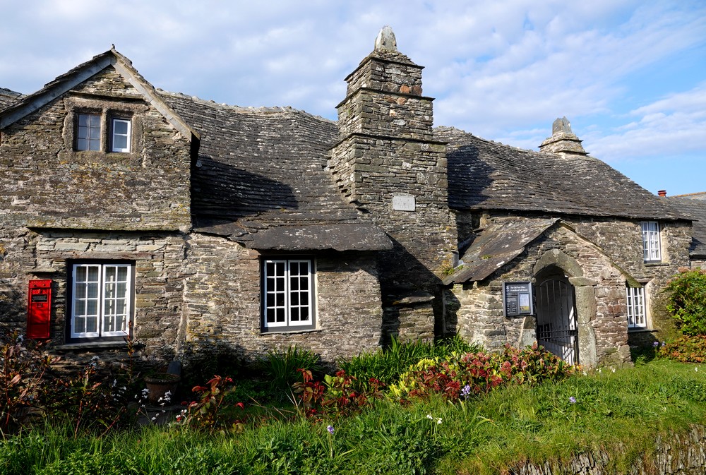 Histoire de faire mentir ceux qui pensent qu’en Angleterre il pleut souvent, la météo est encore très clémente ce matin ! Vers 8h, nous partons à pied vers la route, et vingt minutes plus tard, nous embarquons dans un bus pour un court trajet vers Tintagel. C’est moins fatiguant qu’à vélo, et surtout, cela nous permettra de rentrer à pied via le sentier côtier. Nous commençons par descendre la rue principale, dont l’édifice le plus pittoresque est sa vieille poste, une maison de 1380 transformée en bureau postal au XIXe siècle.