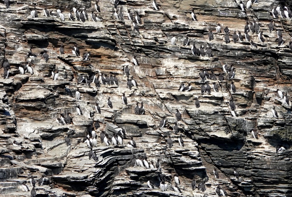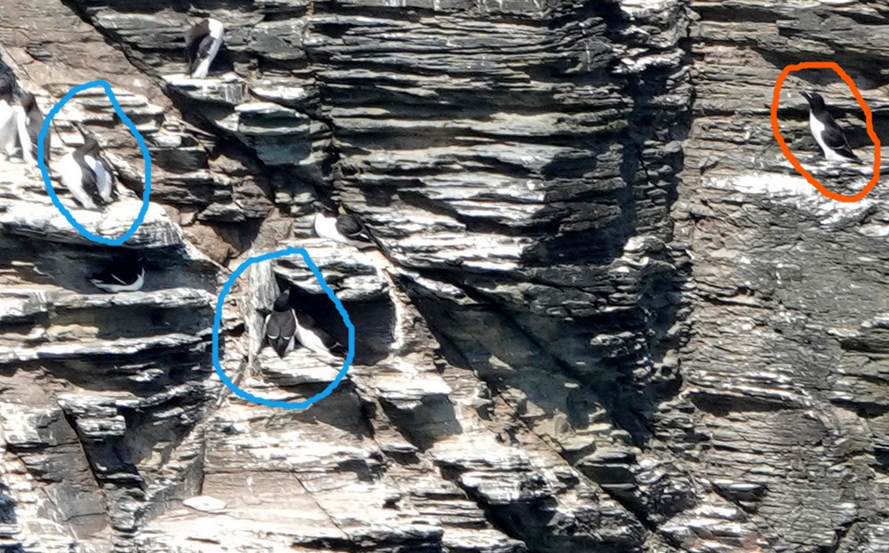 En regardant de plus près – c’est-à-dire dans le zoom de l’objectif ! – nous découvrons avec surprise qu’il s’agit de guillemots de Troïl et de petits pingouins : incroyable, c’est une première pour nous ! A la différence des manchots qui se déplacent en marchant ou en nageant – observés dans l’hémisphère sud à Punta Tombo en Argentine, à Chiloe au Chili ou encore en Nouvelle-Zélandeces petits pingouins quittent leur rocher en volant avant de plonger dans la mer afin de se ravitailler. Même de loin, nous parvenons à bien observer cette colonie et tentons même de distinguer, grâce à leur bec différents, les guillemots des pingouins. Une très belle surprise à laquelle on ne s’attendait pas ! (Ci-dessous, entourés en bleu des guillemots et en rouge un petit pingouin)