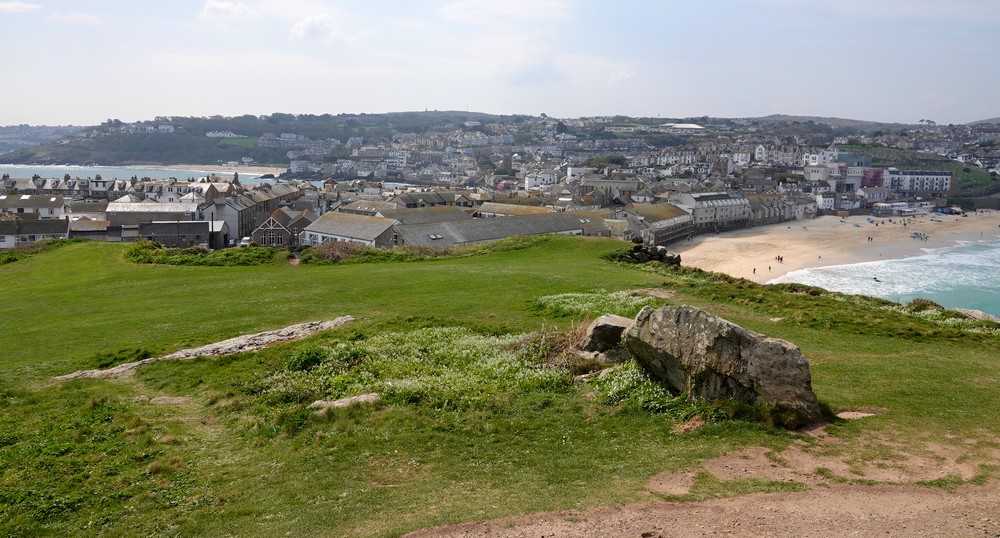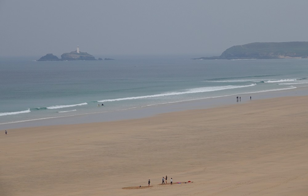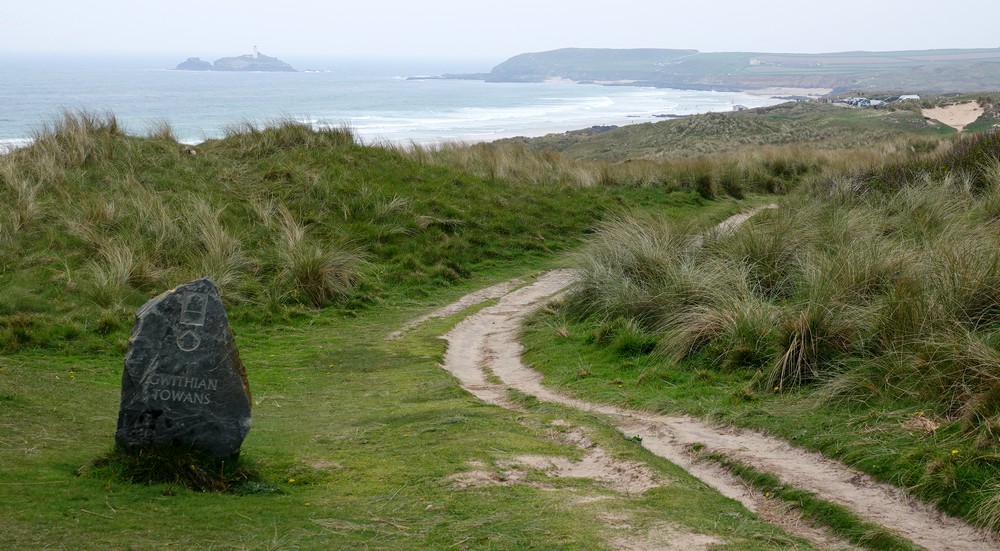 Malgré la brume, on aperçoit Carbis Bay Beach d’un côté – mais on peine à distinguer le petit port de Saint Ives, plus lointain – et le phare de Godrevy de l’autre : un panorama qui nous enchante aussitôt !