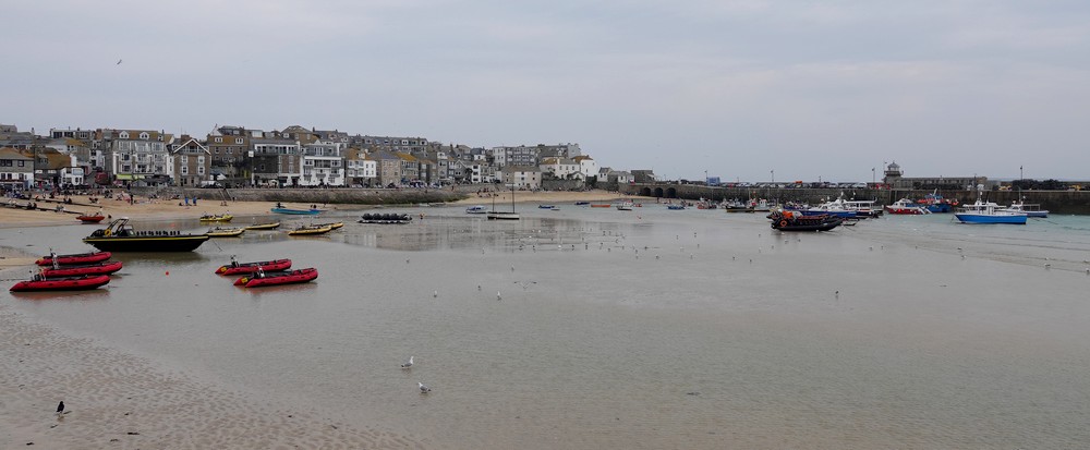 La descente se poursuit jusqu’au port où on arrive… presque deux heures trente après notre départ ! Pour le coup, on a vraiment pris notre temps, et un rapide regard au compteur nous indique que l’on a pédalé presque 20km. Google map se serait-il trompé ? Première impression : il y a un monde fou ! On se gare sur le quai, et on part à pied arpenter la ville, notamment la petite presqu’ile qui domine Saint Ives des deux côtés.