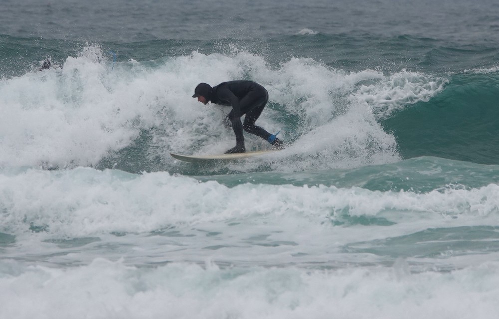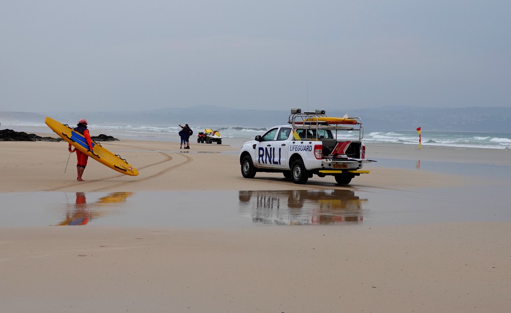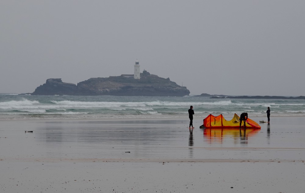 Il marche jusqu’à la plage de Gwithian où les kite surfs et les surfeurs sont de sortie ! A cause des forts courants, il y a une patrouille de sauveteurs qui balise les portions de côtes où les activités en mer sont sécurisées, portions matérialisées par de petits drapeaux qui changent fréquemment de place en fonction de la marée.