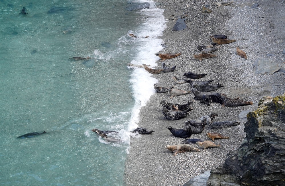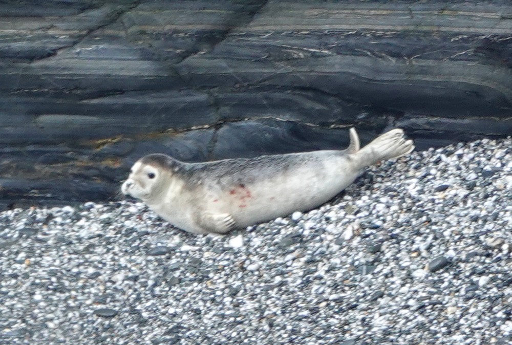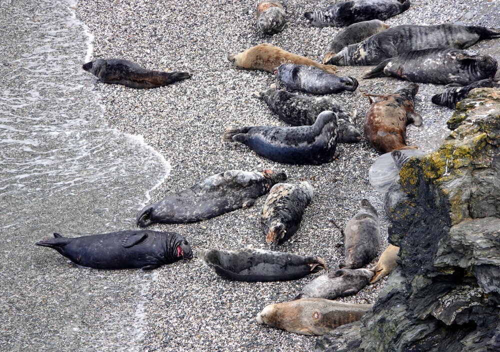 Nous poursuivons le sentier, et en surplomb de Mutton Cove, énorme surprise : on découvre une colonie d’une trentaine de phoques qui se dorent sur la plage. Fantastique ! Bien entendu, on passe un long moment à les observer…
