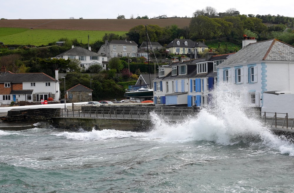 Après avoir fait tout le tour du village et même grimpé sur les hauteurs pour un panorama complet, Gérard renfourche son vélo et pédale deux kilomètres pour rejoindre Portmellon. Ici, à marée haute, c’est la douche assurée car les vagues viennent taper sur la route !
