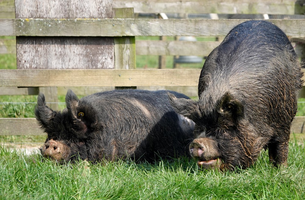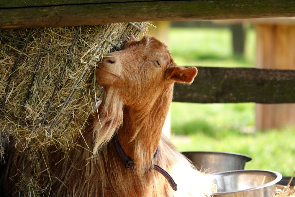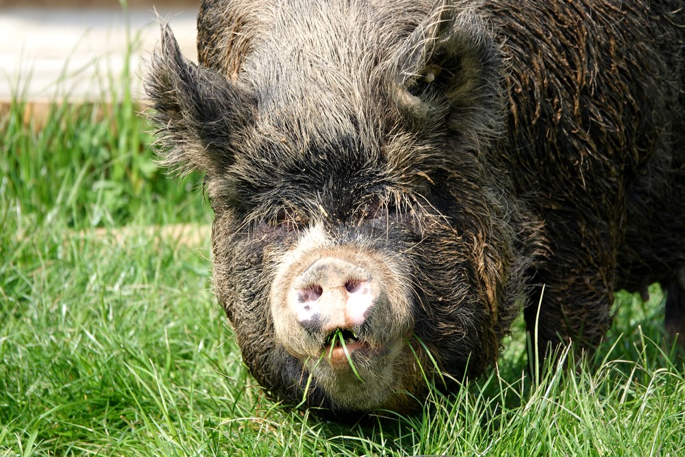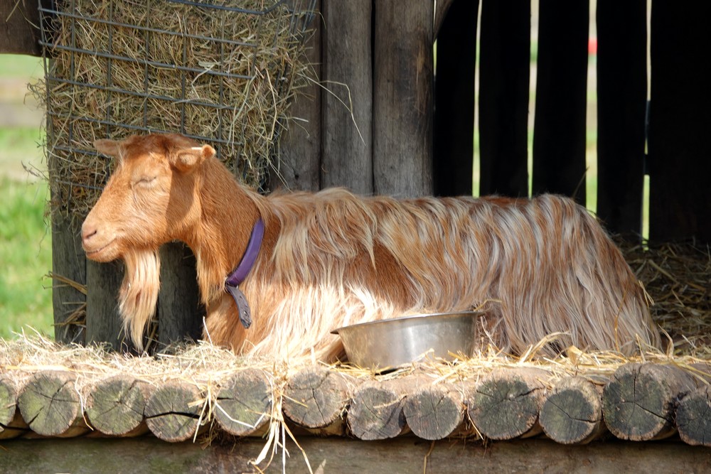 Nous nous dirigeons ensuite vers la ferme où cochons et chèvres nous regardent passer avec philosophie – eh oui, ils sont habitués au public ! Petite déception concernant les poules – de nombreuses espèces sont présentes sur le domaine – que nous ne verrons pas : grippe aviaire oblige, elles sont confinées, sans masque, au poulailler !