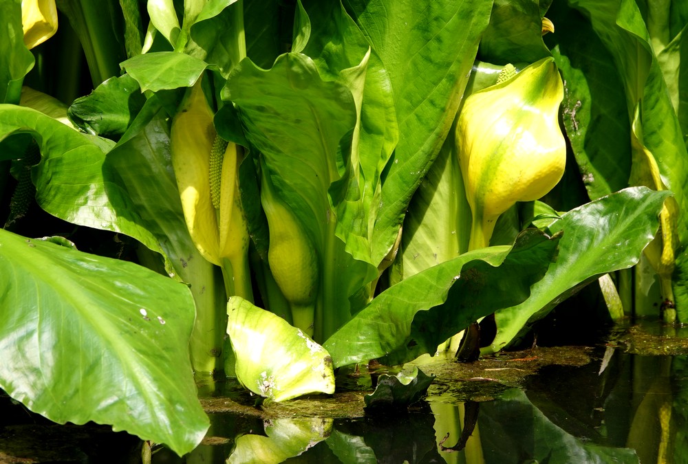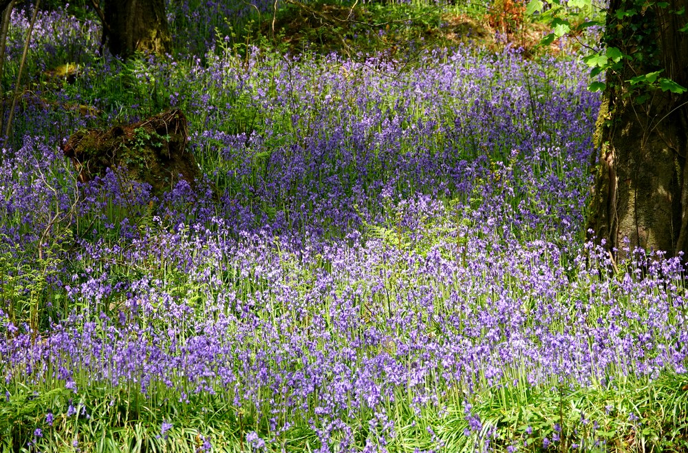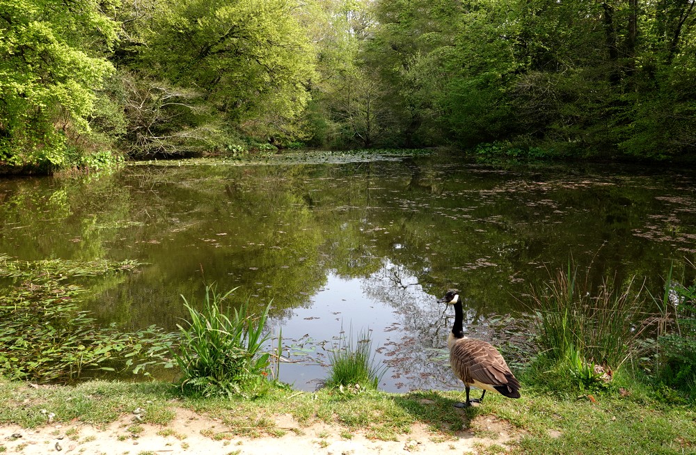 La balade se poursuit ensuite dans un bois tapissé de jacinthes sauvages, sur une large piste bien pentue qui nous conduit à la Vallée perdue. Ici, la végétation est dense, mais le cadre est charmant, avec sa rivière et sa pièce d’eau parsemée de populages des marais…